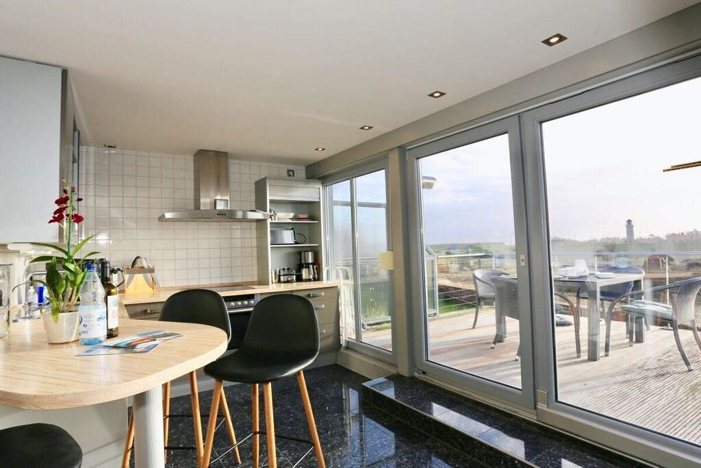 Komfortable Ferienresidenz Kaphaus mit großem Südbalkon und Blick auf Wattenmeer, Hafen und Leuchtturm in Juist.
