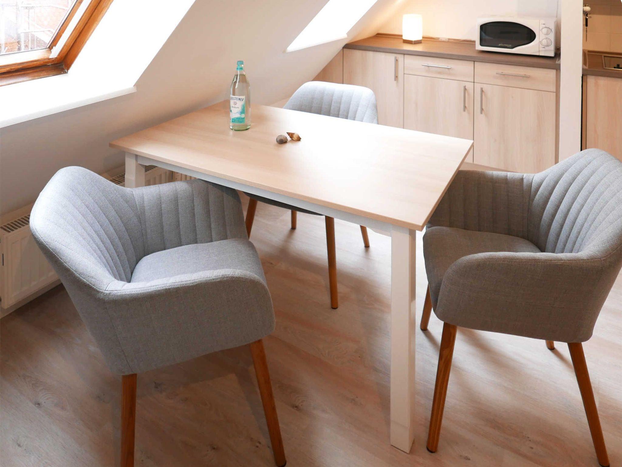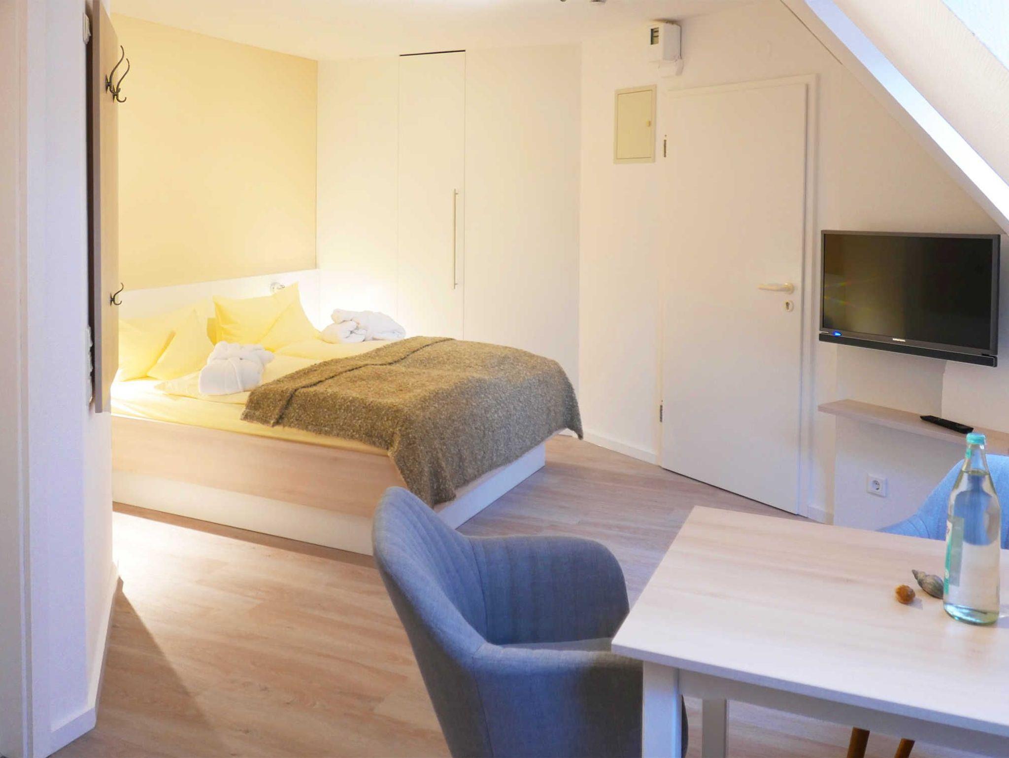 Studio für 2 Personen nach Süden ausgerichtet mit integrierter Kochnische und Duschbad. Es gibt ein Doppelbett(160x200), einen großen Schrank und einen Esstisch mit Stühlen. Flachbildfernseher