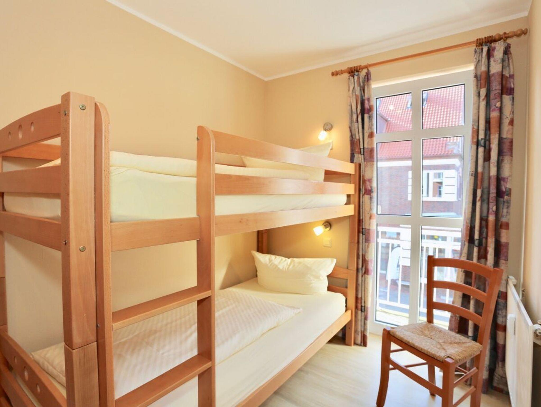 Schöne hell eingerichtete Ferienwohnung für 4 Personen im 1. Stock gelegen. Die Wohnung besteht aus einem Wohn/Ess/Schlafzimmer, wobei der Schlafbereich optisch vom Wohnraum getrennt ist. Hier steht ein 160x200 großes Doppelbett. Der Wohnbereich ist mit Sat-TV und einem Sofa ausgestattet und hat eine integrierte Pantryküche. Zusätzlich gibt es noch ein Kinderzimmer mit Etagenbett und ein helles Duschbad.