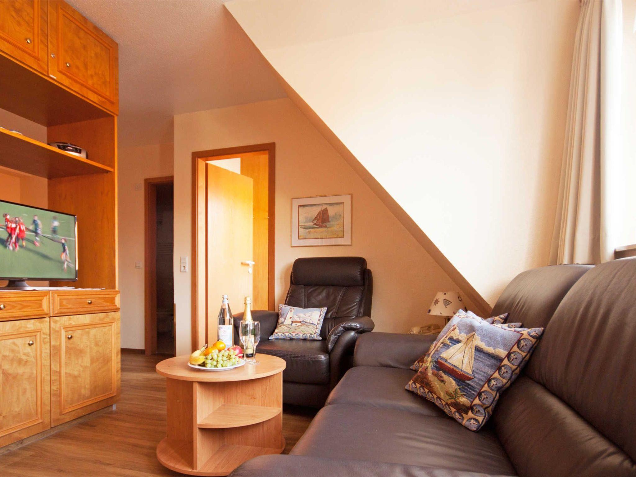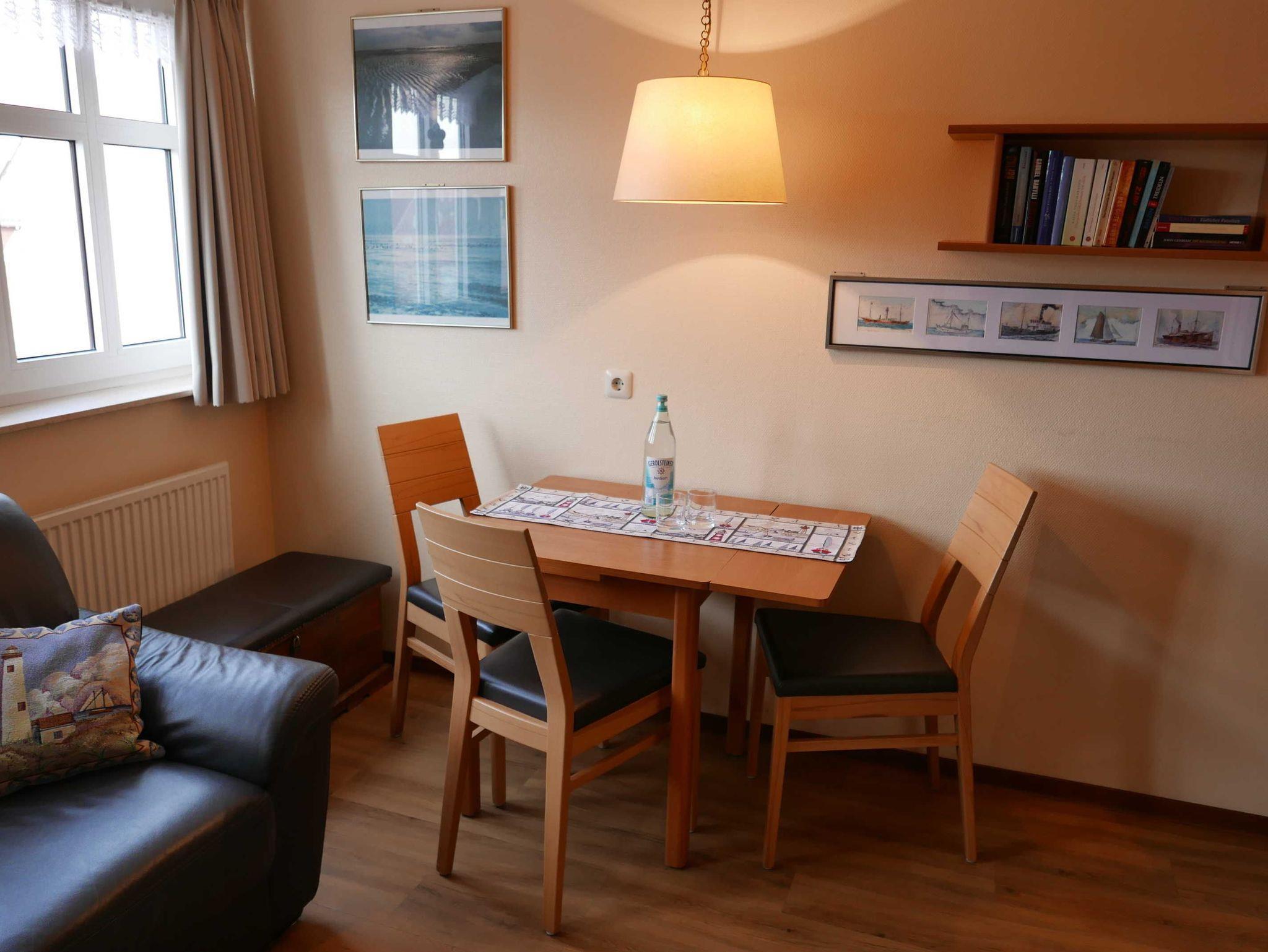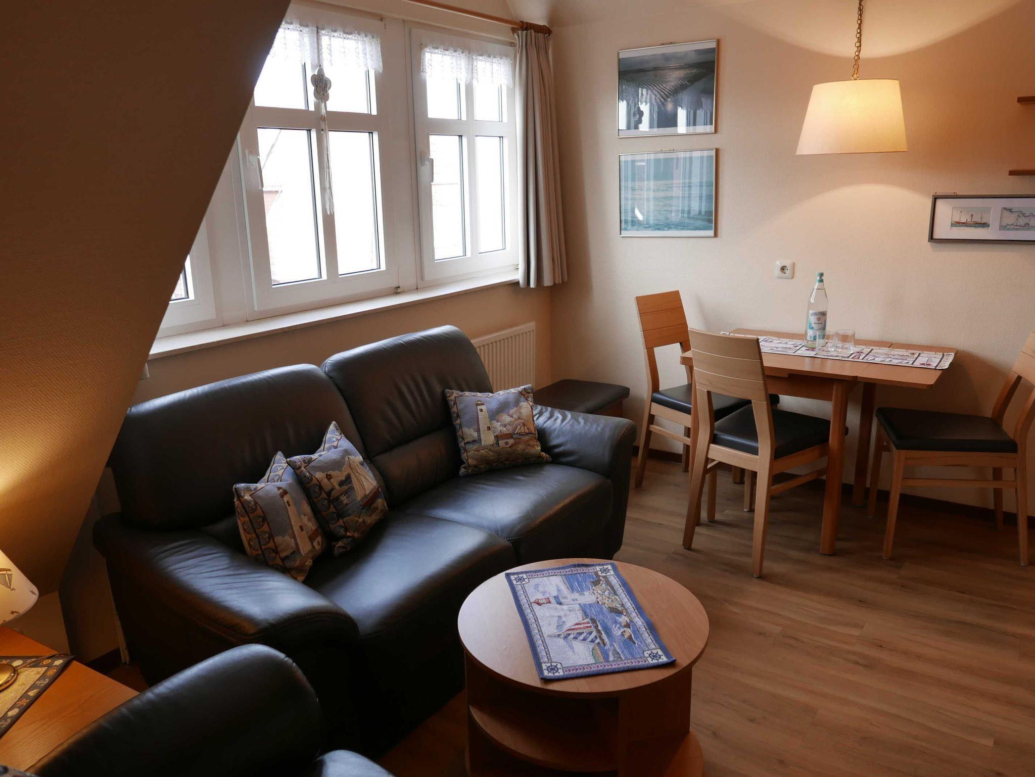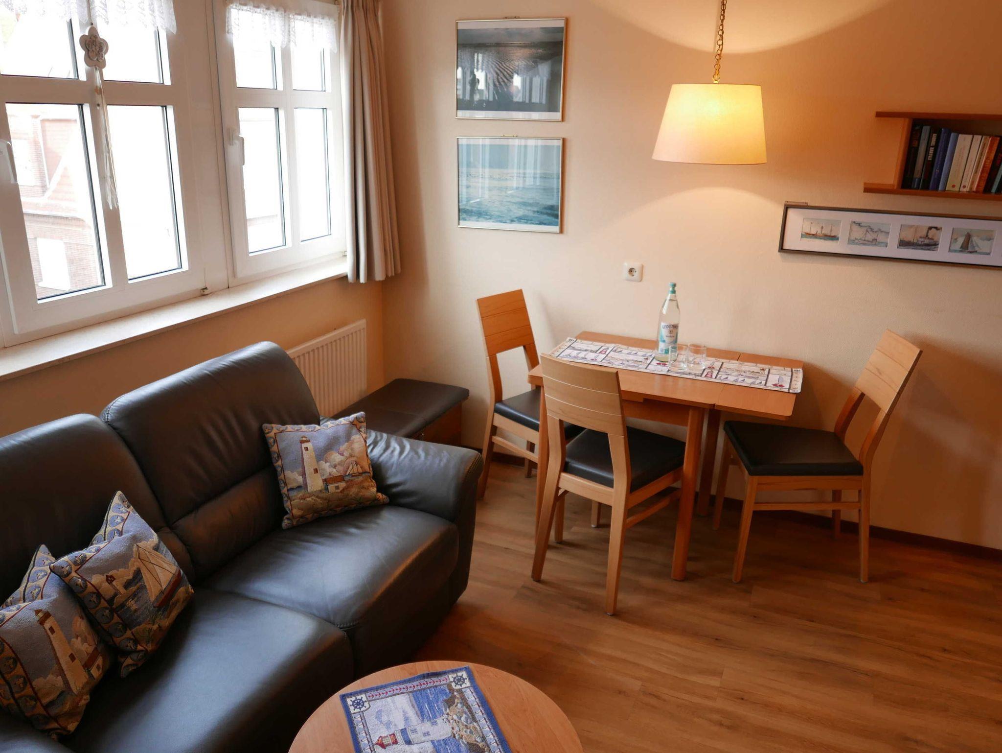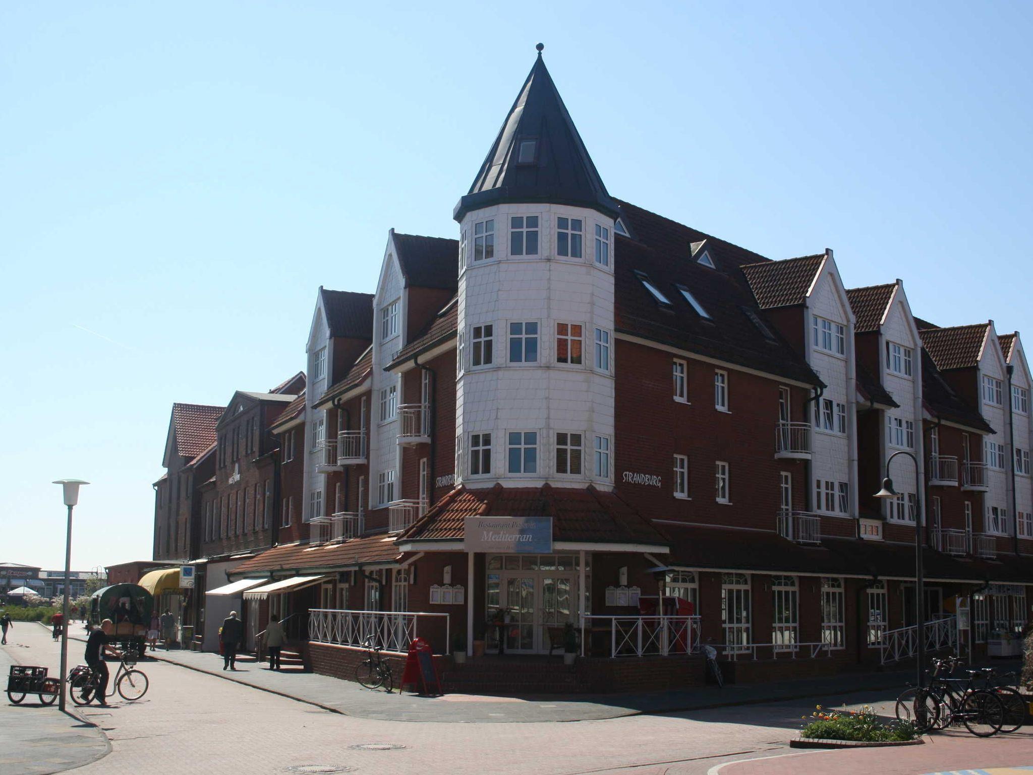 Kleine helle Ferienwohnung für 3 Personen mit extra Schlafzimmer für die dritte Person in der Strandburg nur 200 m vom Meer entfernt. Aufzug vorhanden. Die Inselresidenz Strandburg verbindet das Ambiente eines Hotels mit der Gemütlichkeit einer Ferienwohnung. Bei schlechtem Wetter kann das hauseigene Schwimmbad genutzt werden. Ebenfalls im Wellnessbereich ist eine Sauna, Ruheraum sowie ein Solarium vorhanden. Internet im ganzen Haus.