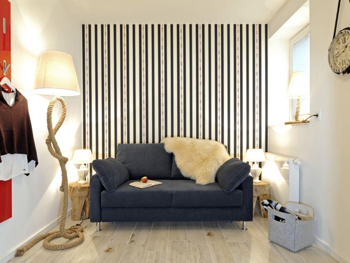 Vom Flur aus gelangen Sie über eine Treppe zu den drei Schlafzimmern, eines ist mit Boxspringbett, eines mit zwei Einzelbetten und eines mit Schlafcouch ausgestattet.