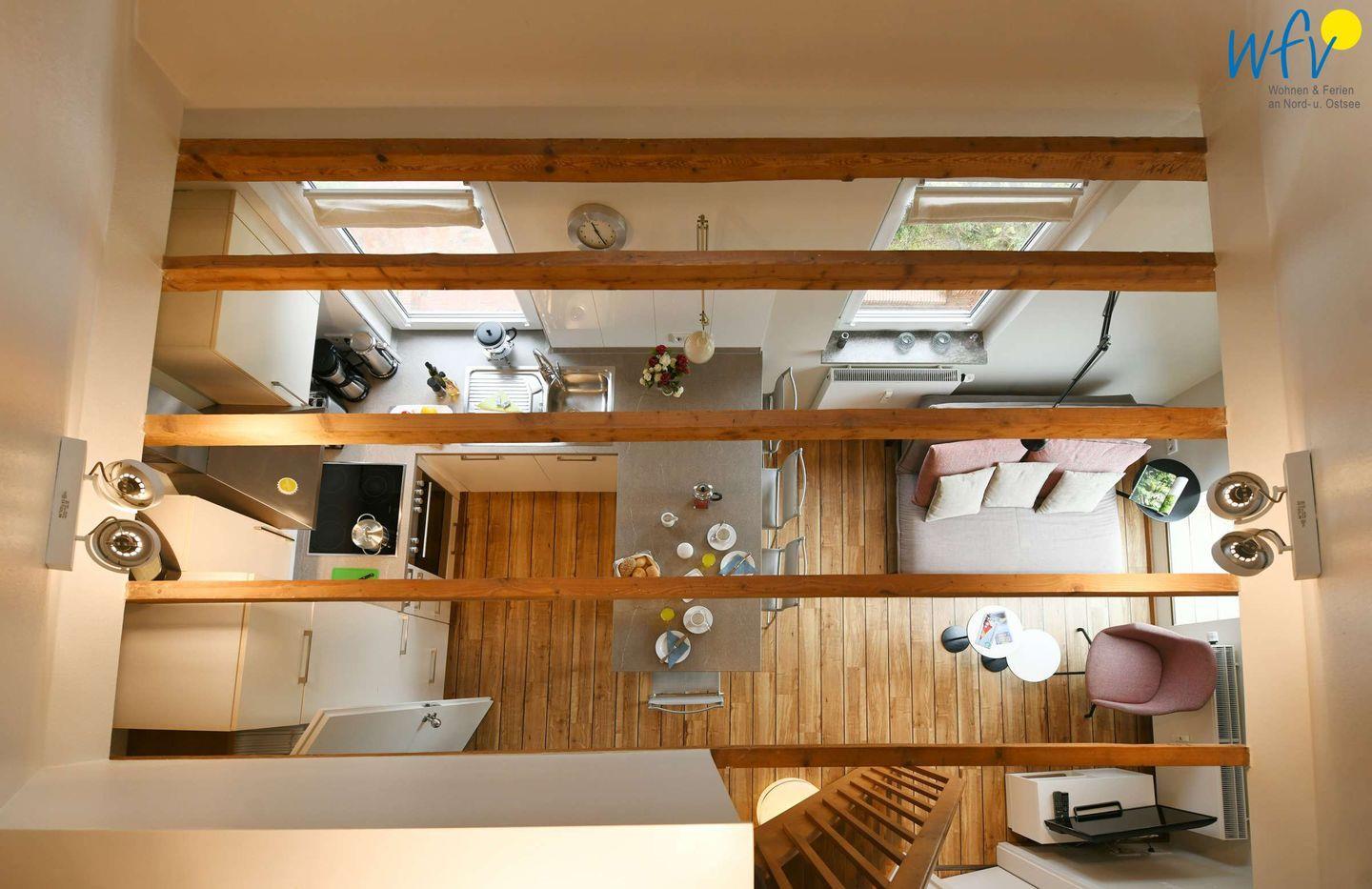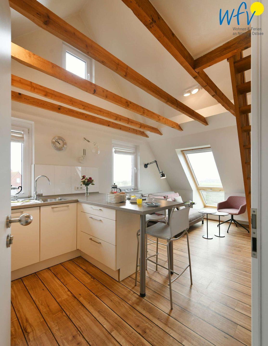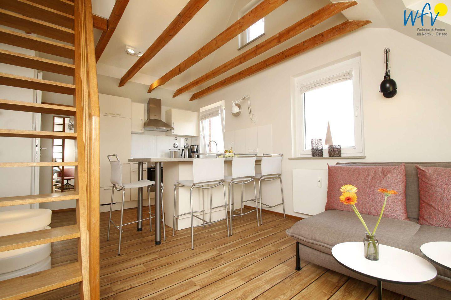 Die offene Decke und große Fenster zum Wattenmeer verleihen der Ferienwohnung eine schöne Weite. In der Wohnküche kann am Tresen gemeinsam gekocht und gegessen werden. Vom Cabriofenster aus lädt der Blick über das Wattenmeer zum Träumen ein.