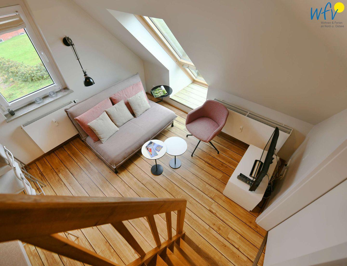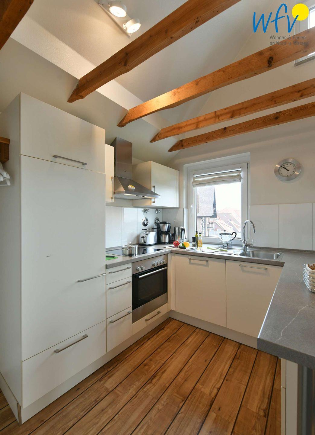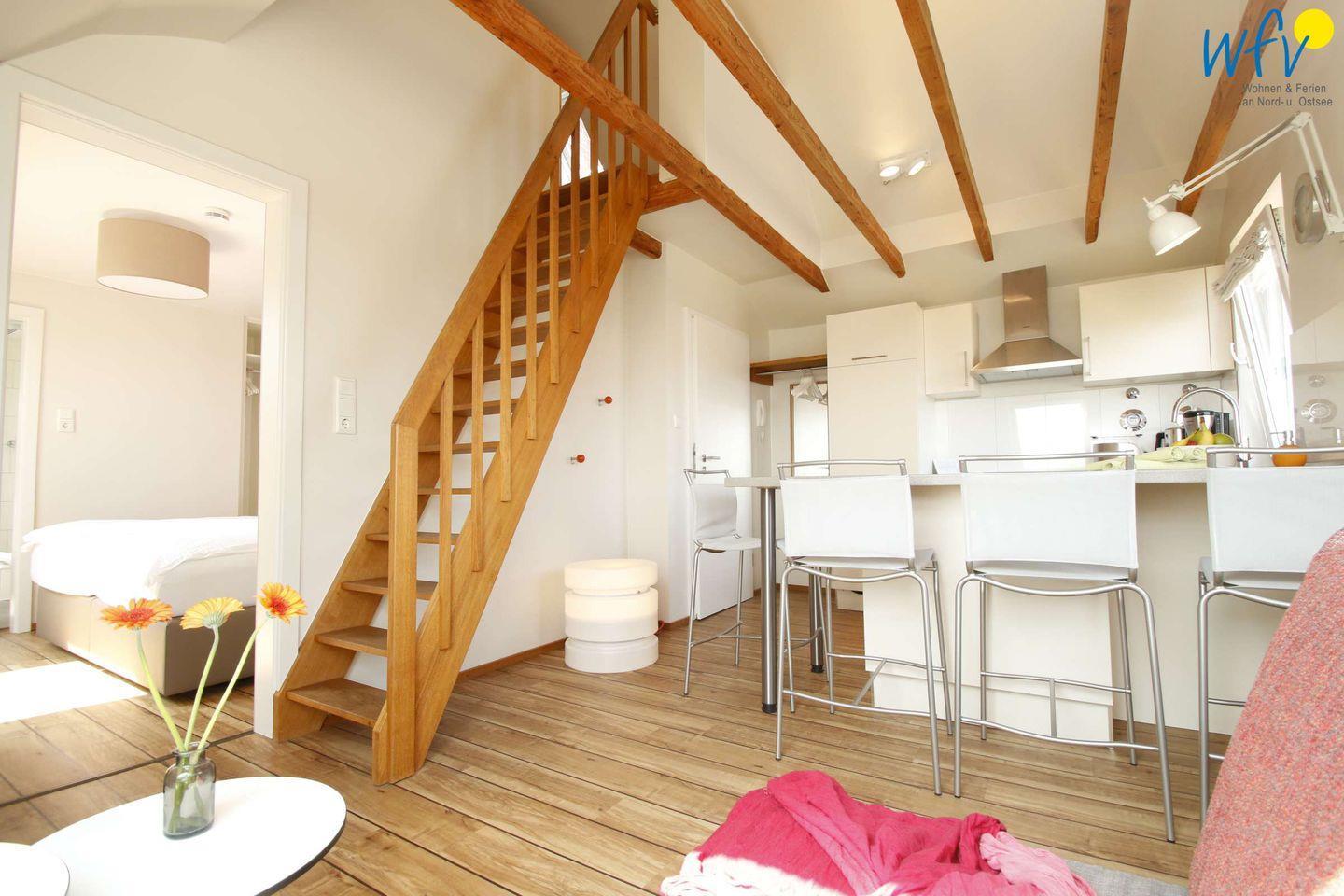 Die offene Decke und große Fenster zum Wattenmeer verleihen der Ferienwohnung eine schöne Weite. In der Wohnküche kann am Tresen gemeinsam gekocht und gegessen werden. Vom Cabriofenster aus lädt der Blick über das Wattenmeer zum Träumen ein.