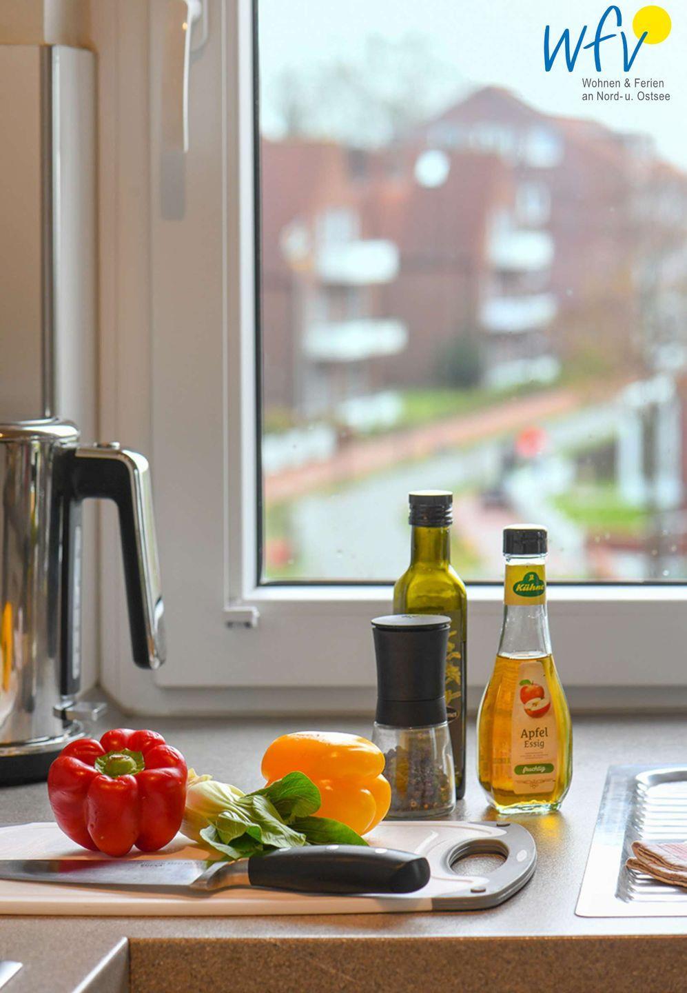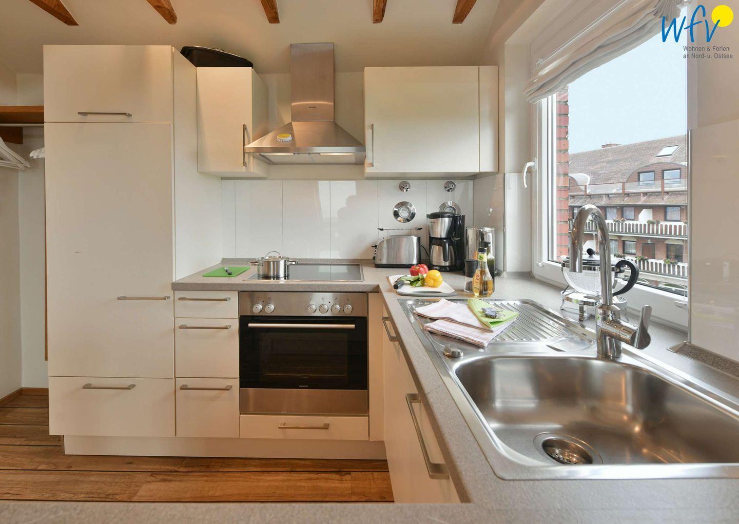 Damit Sie sich in Ihrem Juist-Urlaub bequem selbst verpflegen können, verfügt die Ferienwohnung "Sünnupgang" über eine gut ausgestattete Küchenzeile - u.a. mit einem 4-Platten-Ceranherd, Backofen, Kühlschrank mit Gefrierfach und Geschirrspüler sowie Kaffeemaschine, Wasserkocher, Handrührgerät, Pürierstab, Küchenwaage und Toaster.