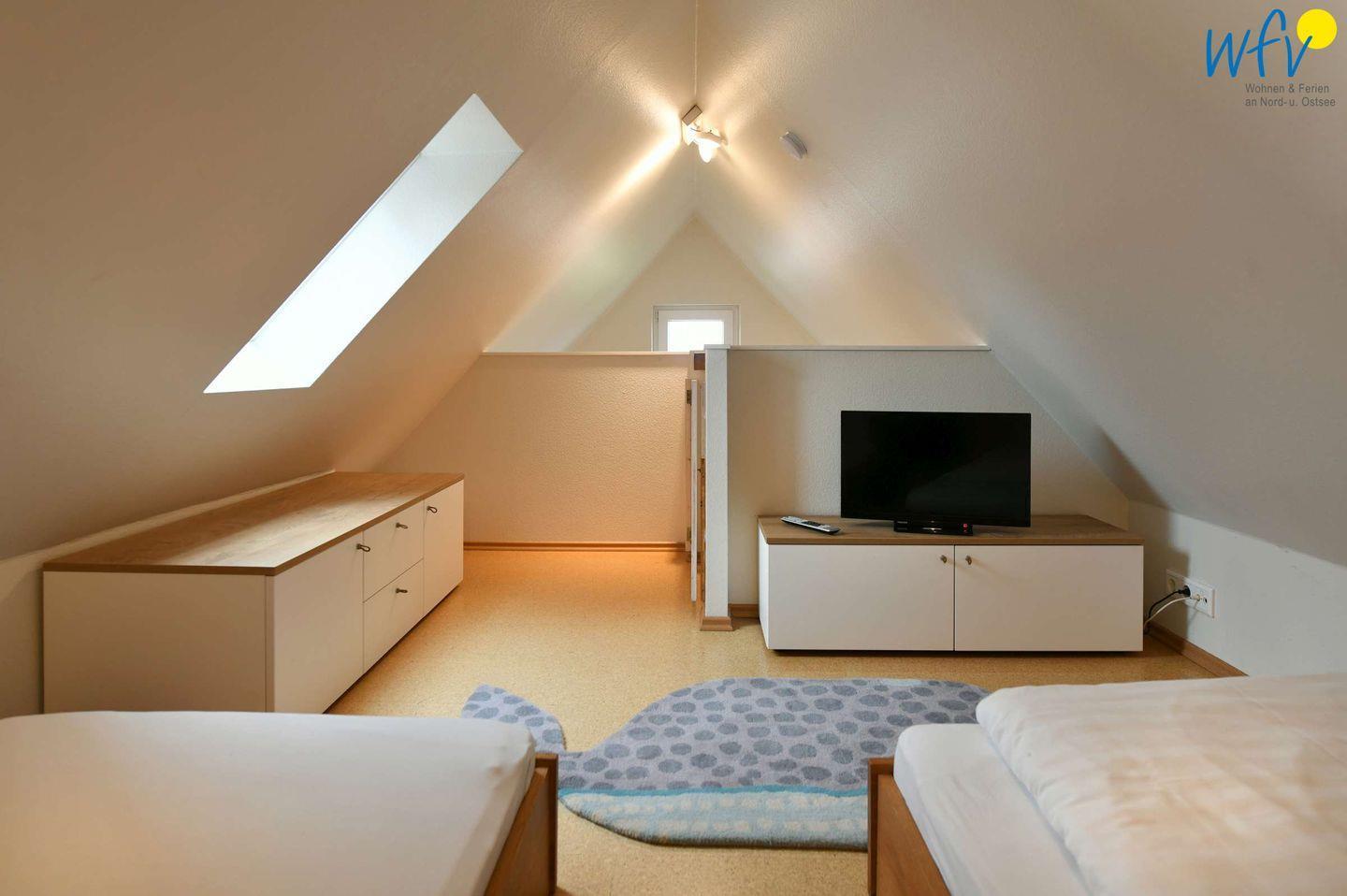 Das geräumige Schlafzimmer verfügt über ein großes Boxtopbett (180 x 200 cm) und viel Stauraum für Koffer und Kleidung. Auch ein Kinderreisebett hat hier bei Bedarf Platz. Über eine offene Galerie gelangt man zu einer Schlafempore, auf der sich zwei Kinder gemütlich einrichten können.