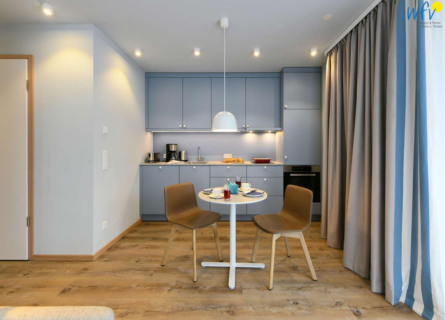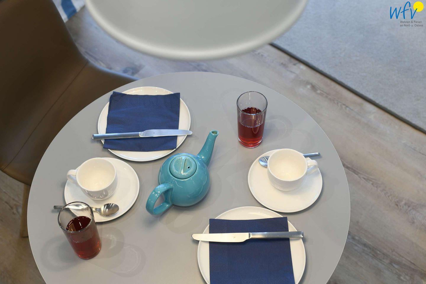 Für eine bequeme Selbstverpflegung verfügt die Ferienwohnung "Robbe" über eine gut bestückte Einbauküche – u.a. mit Herd, Backofen und Spülmaschine. Zusätzlich zur Filterkaffee-Maschine ist eine NESPRESSO vorhanden. Für gemeinsame Mahlzeiten wurde eine gemütliche Essecke eingerichtet.