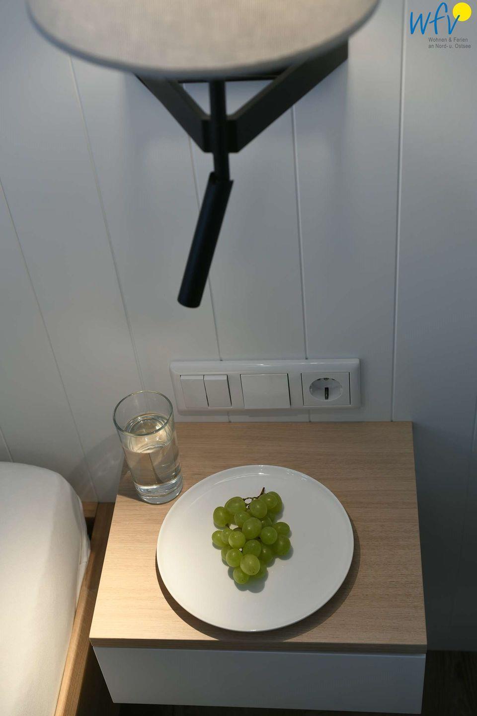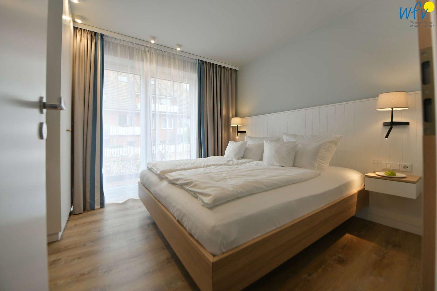 Ein gehobener Stil erwartet Sie auch in dem separaten Schlafzimmer der Ferienwohnung. Es ist mit einem komfortablen Doppelbett mit hochwertigen Matratzen (210 x 200 cm; exklusives SCHRAMM-Bettsystem plus Topper), einem Kleiderschrank und einem zusätzlichen SmartTV mit WLAN-Anschluss ausgestattet. Es bestehen gute Verdunkelungsmöglichkeiten.