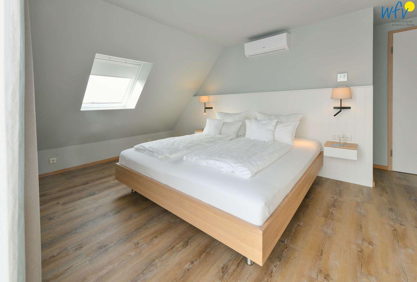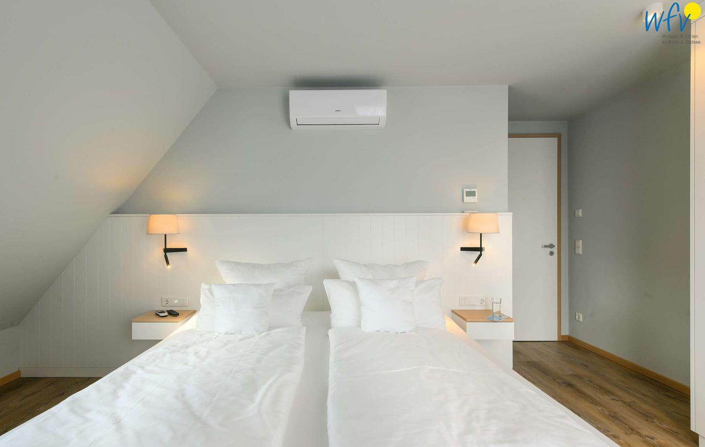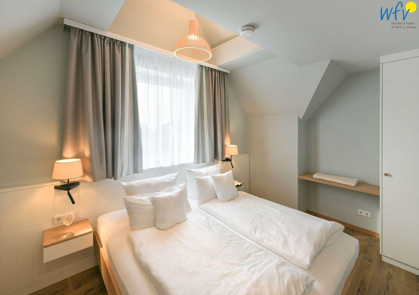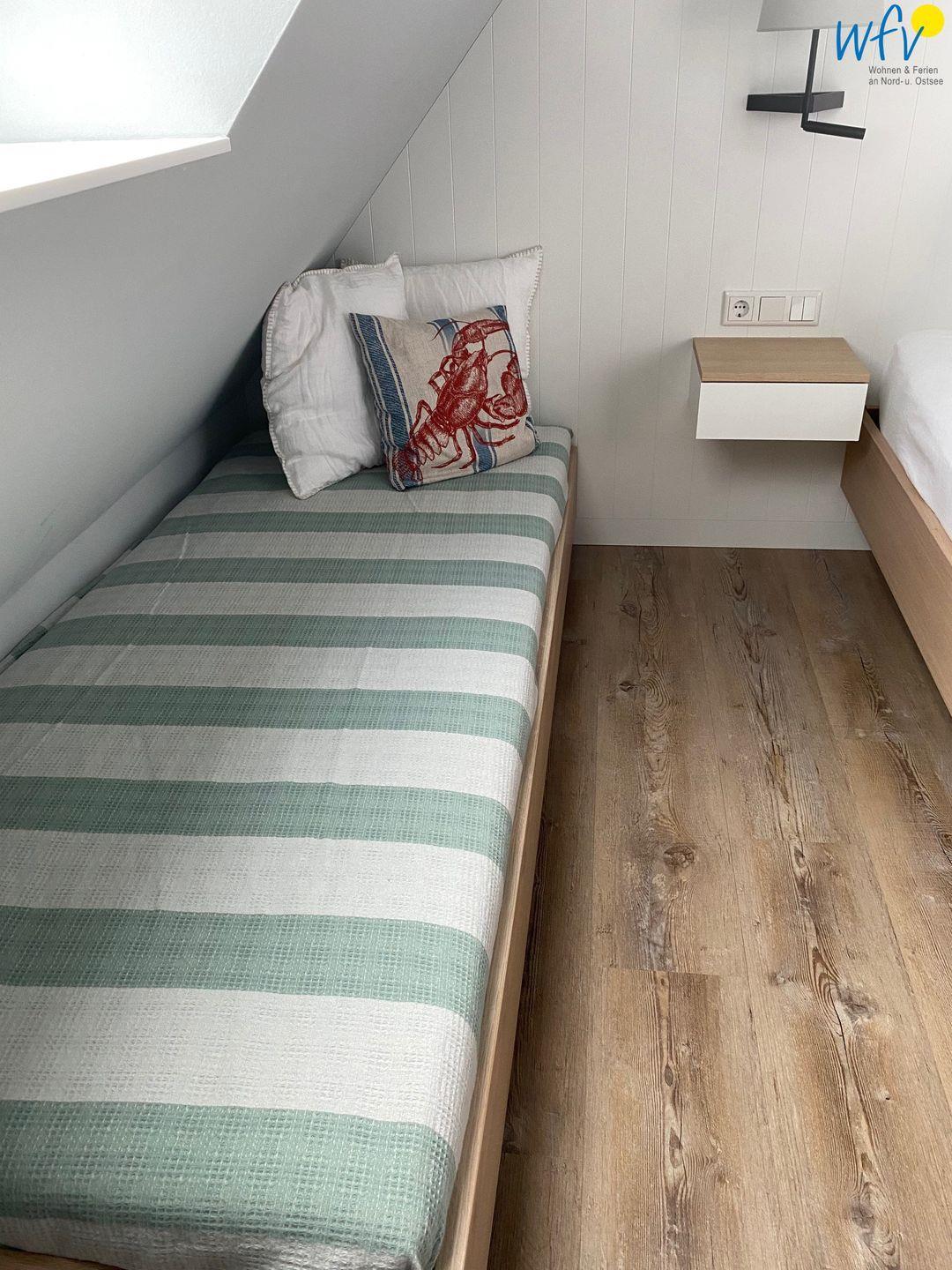 Die Ferienwohnung "Hummer" auf Juist verfügt über zwei separate Schlafzimmer. Eines ist mit einem Doppelbett (2 x 2,10 m) sowie mit einem zusätzlichen Einzelbett 80 X 2,10 m eingerichtet. Das andere Schlafzimmer mit Doppelbett bietet die Möglichkeit für ein weiteres Babybett. Alle Betten sind mit einem exklusiven SCHRAMM-Bettsystem plus Topper ausgestattet. In den Schlafzimmern befinden sich jeweils ein Kleiderschrank und ein SmartTV mit WLAN-Anschluss sowie ein kleiner Schreibtisch. Es bestehen gute Verdunkelungsmöglichkeiten.