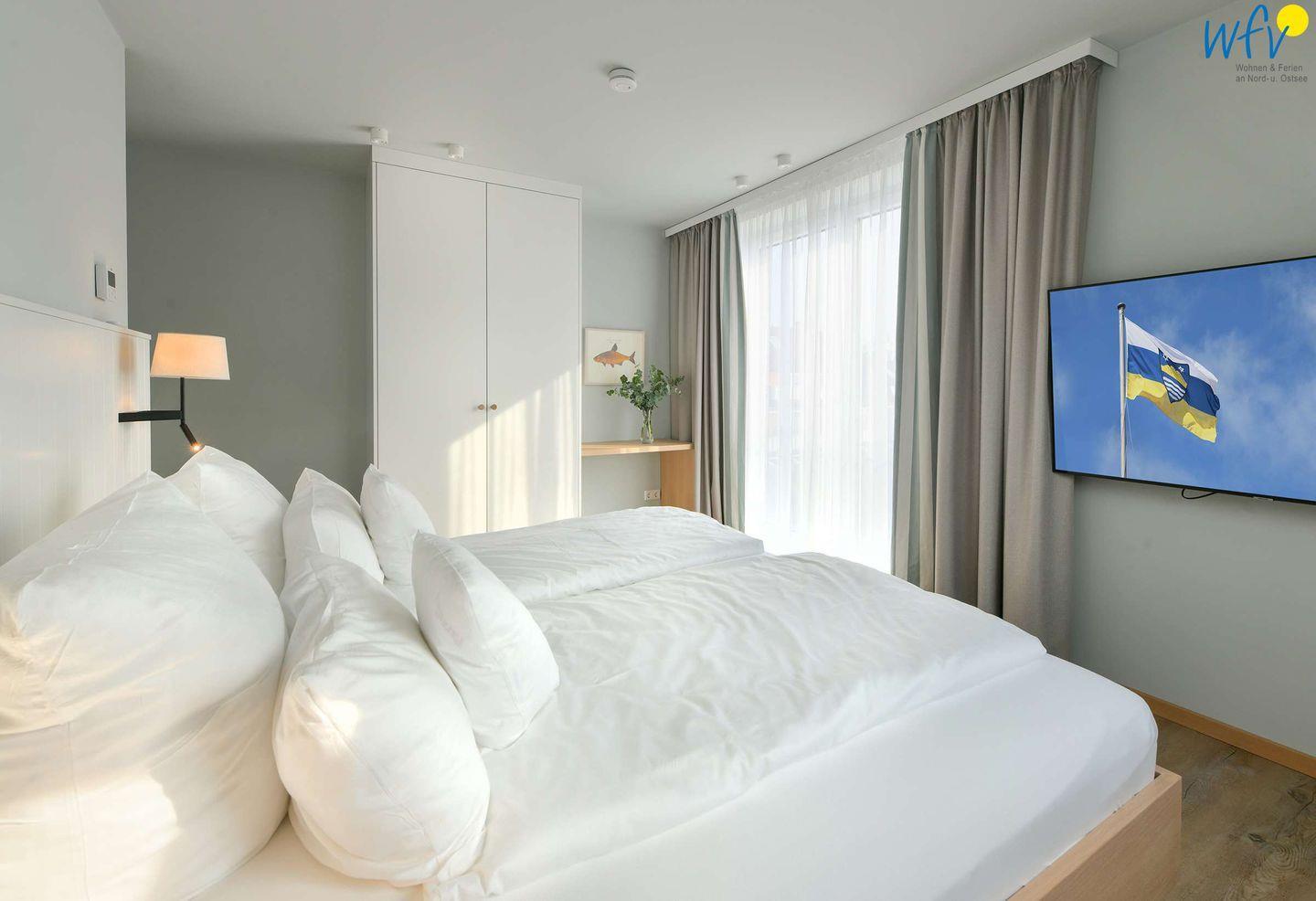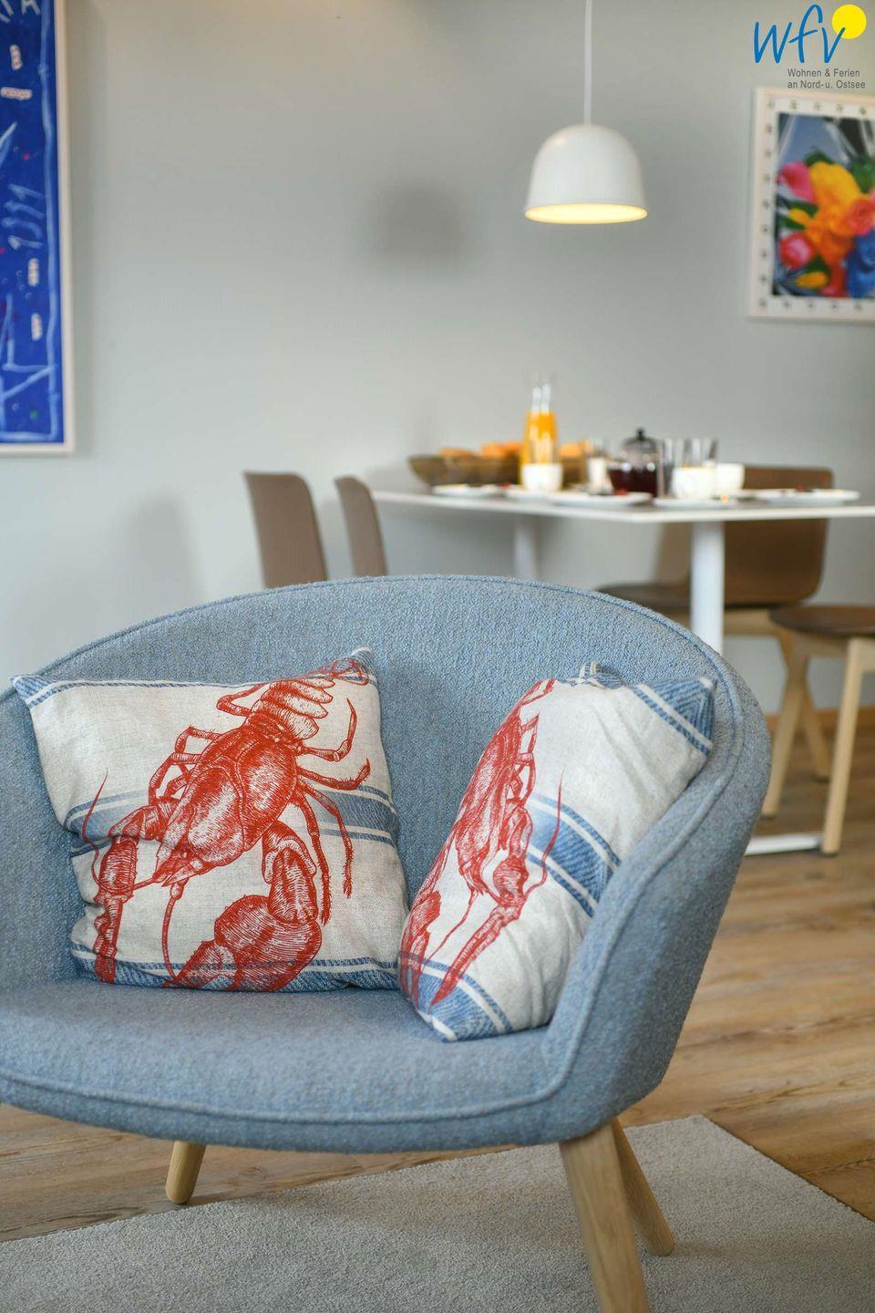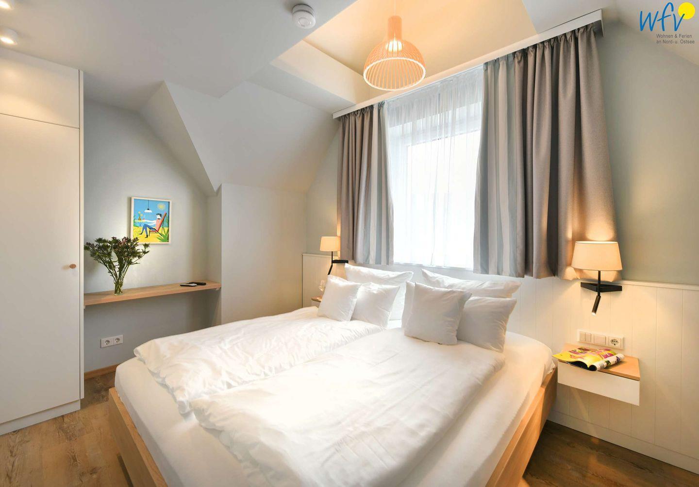 Die Ferienwohnung "Hummer" auf Juist verfügt über zwei separate Schlafzimmer. Eines ist mit einem Doppelbett (2 x 2,10 m) sowie mit einem zusätzlichen Einzelbett 80 X 2,10 m eingerichtet. Das andere Schlafzimmer mit Doppelbett bietet die Möglichkeit für ein weiteres Babybett. Alle Betten sind mit einem exklusiven SCHRAMM-Bettsystem plus Topper ausgestattet. In den Schlafzimmern befinden sich jeweils ein Kleiderschrank und ein SmartTV mit WLAN-Anschluss sowie ein kleiner Schreibtisch. Es bestehen gute Verdunkelungsmöglichkeiten.