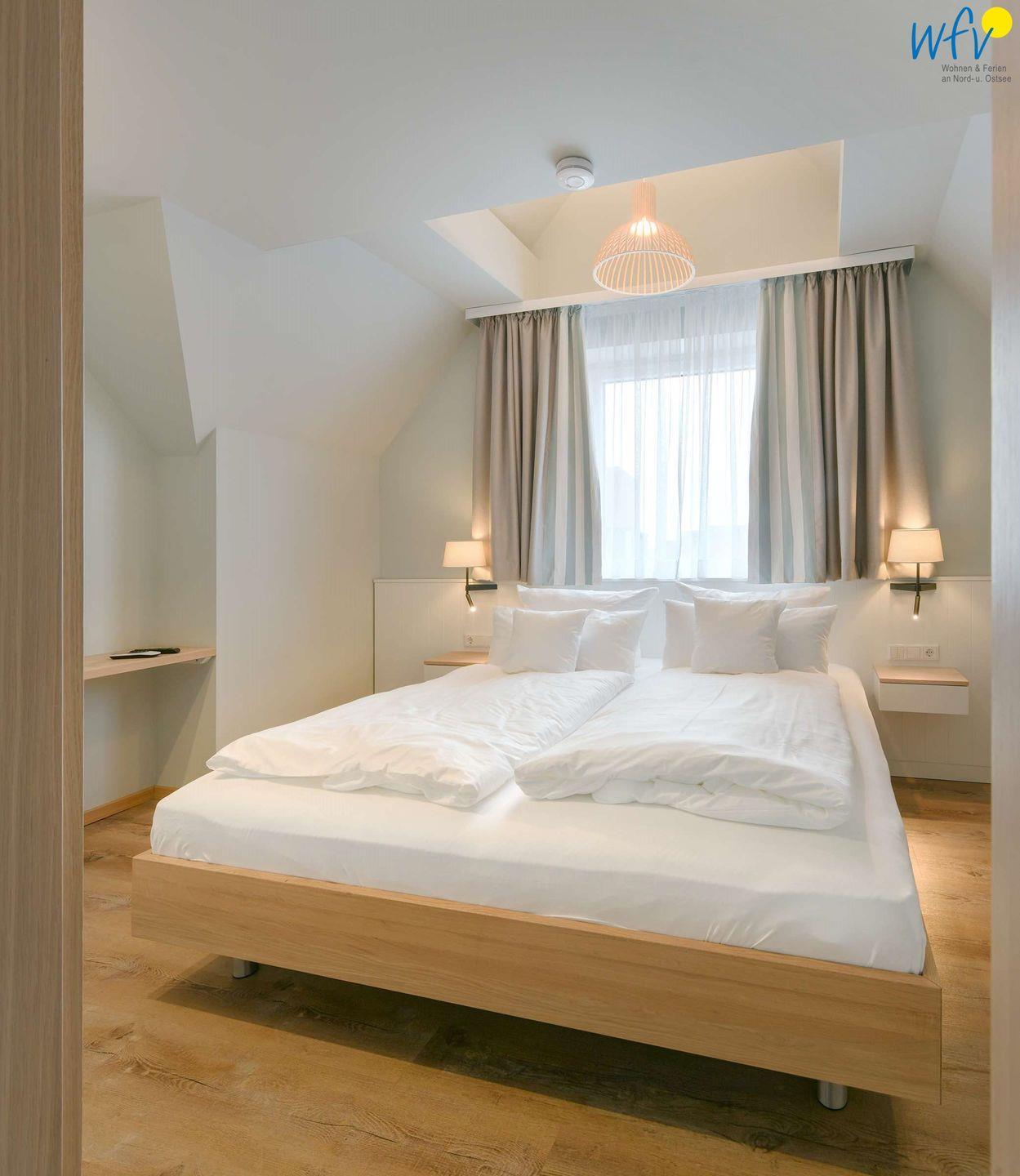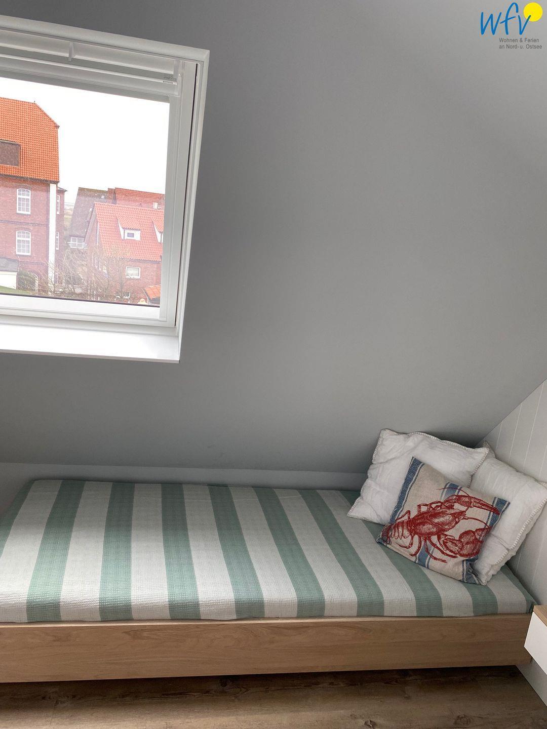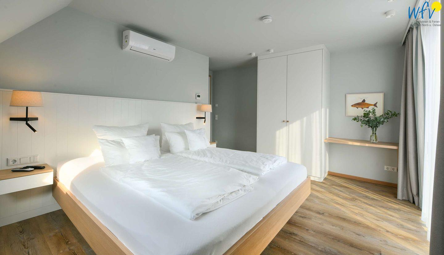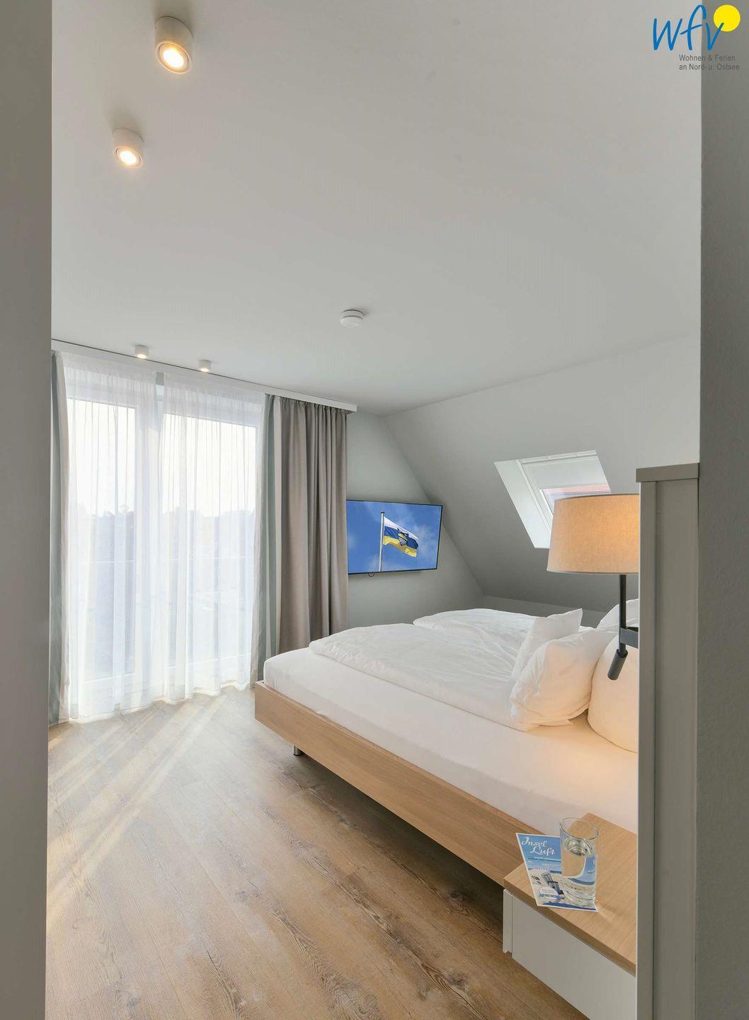 Die Ferienwohnung "Hummer" auf Juist verfügt über zwei separate Schlafzimmer. Eines ist mit einem Doppelbett (2 x 2,10 m) sowie mit einem zusätzlichen Einzelbett 80 X 2,10 m eingerichtet. Das andere Schlafzimmer mit Doppelbett bietet die Möglichkeit für ein weiteres Babybett. Alle Betten sind mit einem exklusiven SCHRAMM-Bettsystem plus Topper ausgestattet. In den Schlafzimmern befinden sich jeweils ein Kleiderschrank und ein SmartTV mit WLAN-Anschluss sowie ein kleiner Schreibtisch. Es bestehen gute Verdunkelungsmöglichkeiten.