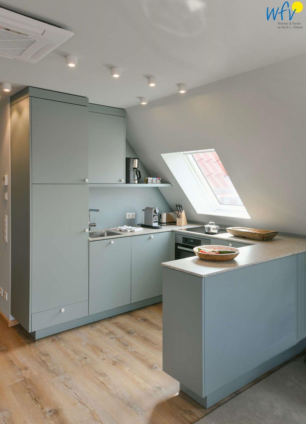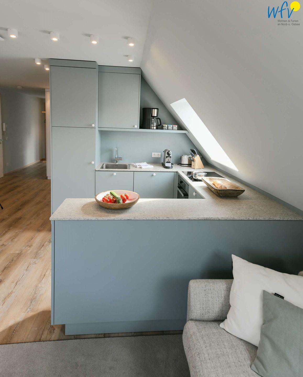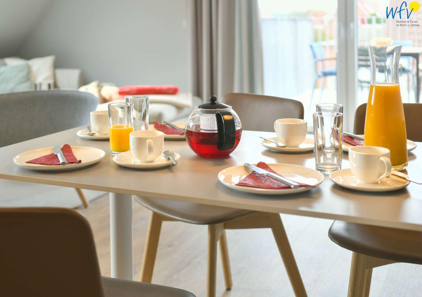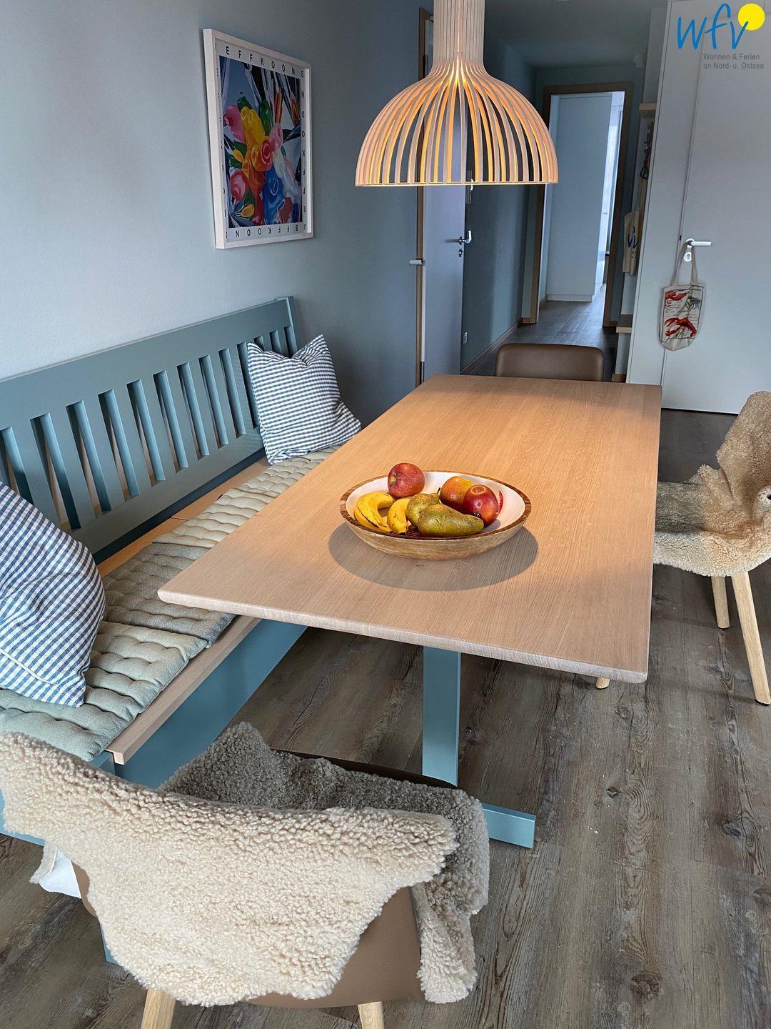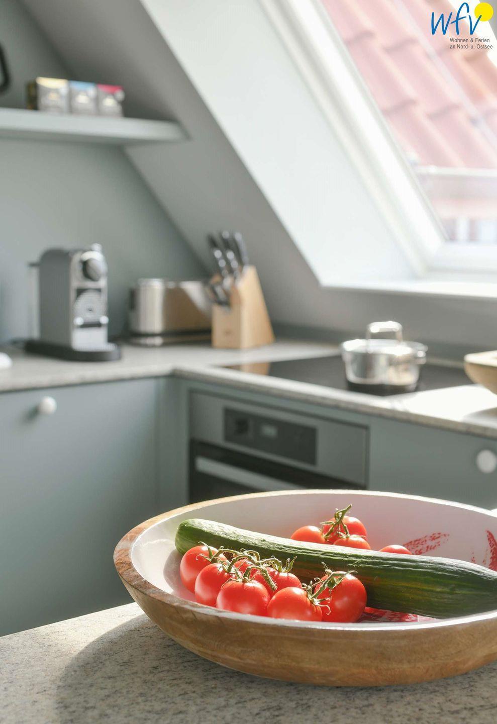 Für eine bequeme Selbstverpflegung ist die Ferienwohnung mit einer gut bestückten Einbauküche ausgestattet – u.a. mit Herd, Backofen und Spülmaschine. Zusätzlich zur Filterkaffee-Maschine ist eine NESPRESSO vorhanden. Gemeinsame Mahlzeiten können Sie an dem freundlichen Essplatz einnehmen.