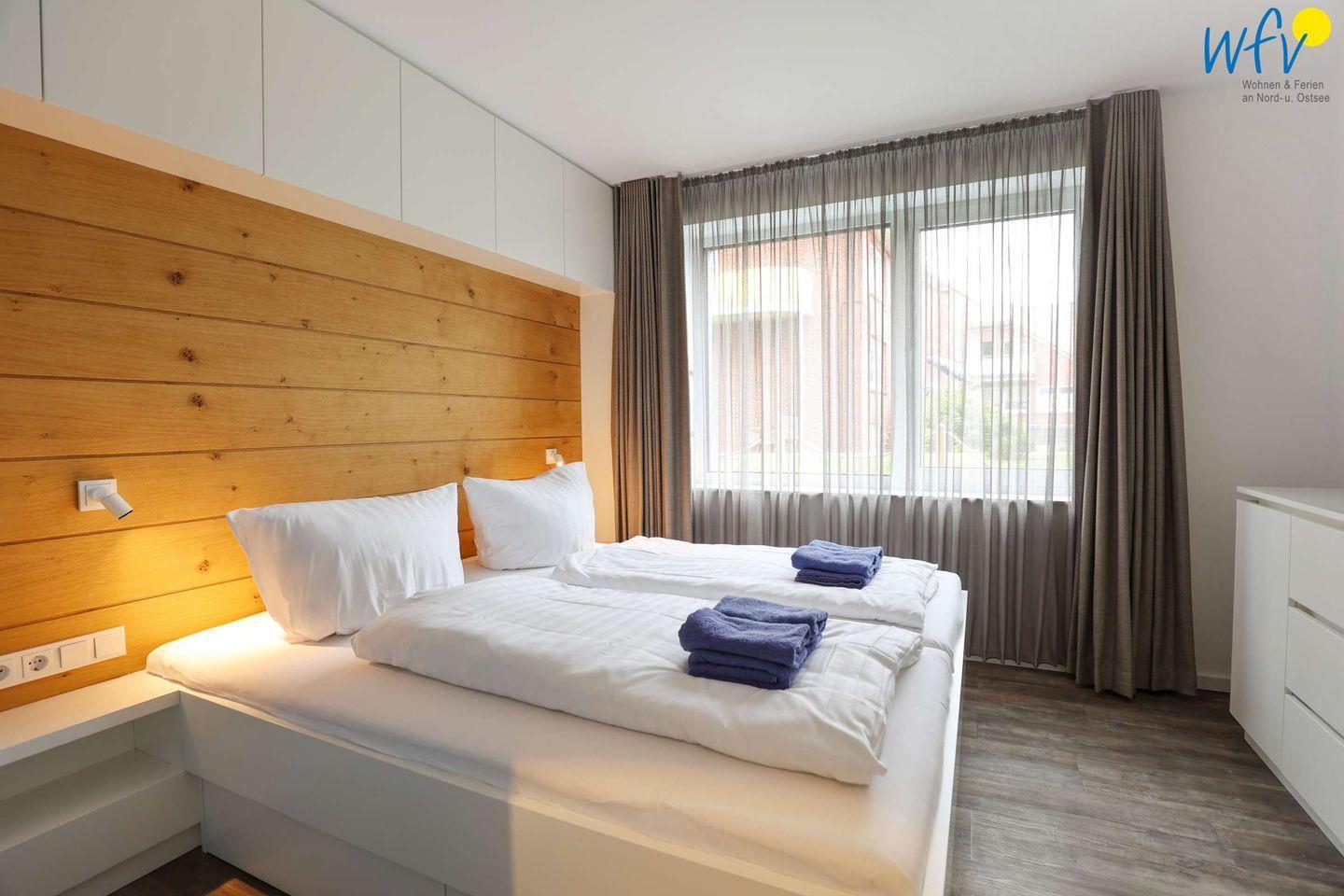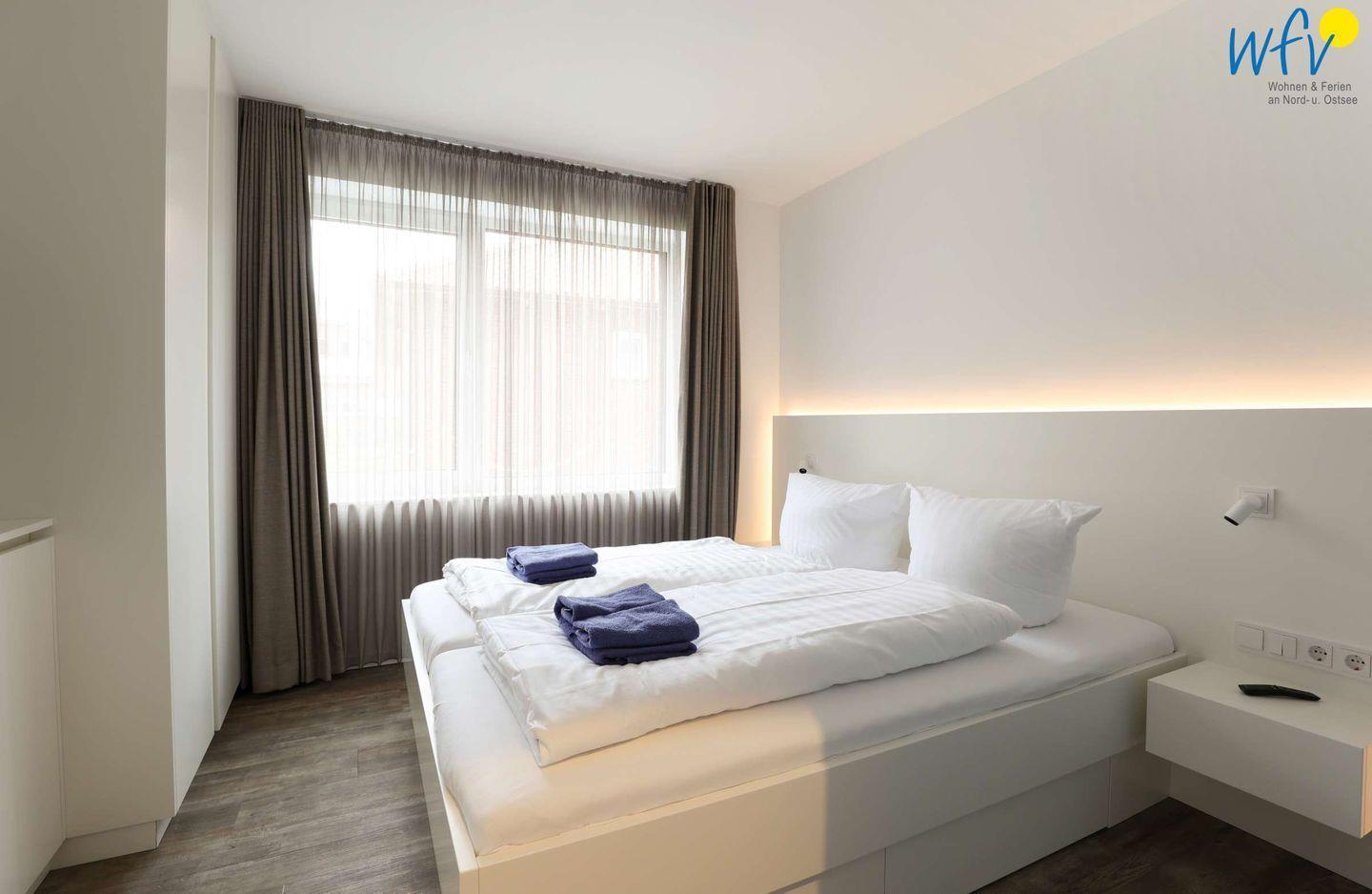 Die zwei separaten Schlafzimmer der Ferienwohnung auf Juist sind jeweils mit einem Doppelbett ausgestattet. In beiden Räumen befindet sich außerdem ein TV. Für einen wohltuenden Schlaf bestehen Verdunkelungsmöglichkeiten.
