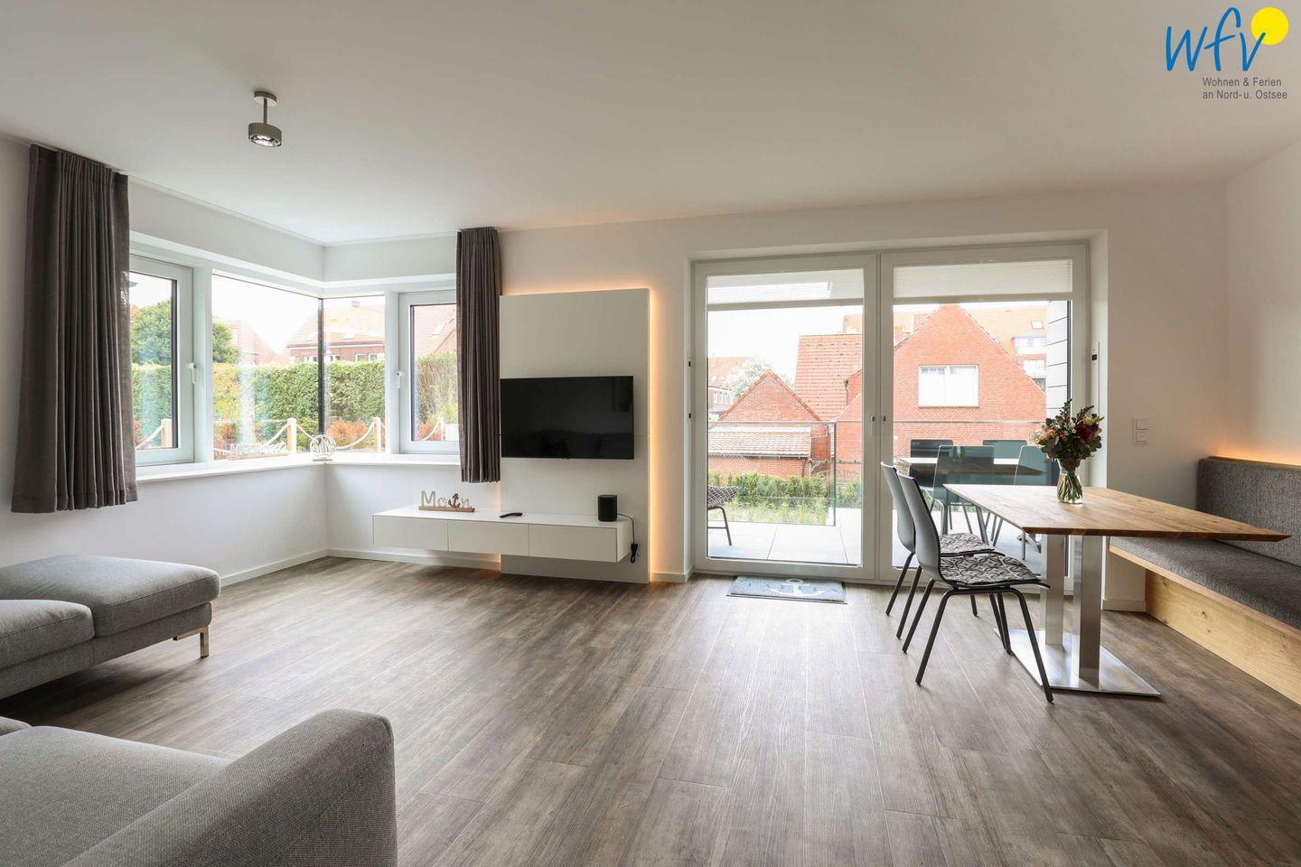 Moderne Ferienwohnung auf Juist mit Balkon, Fußbodenheizung und barrierefreiem Komfort für erholsame Urlaubstage.
