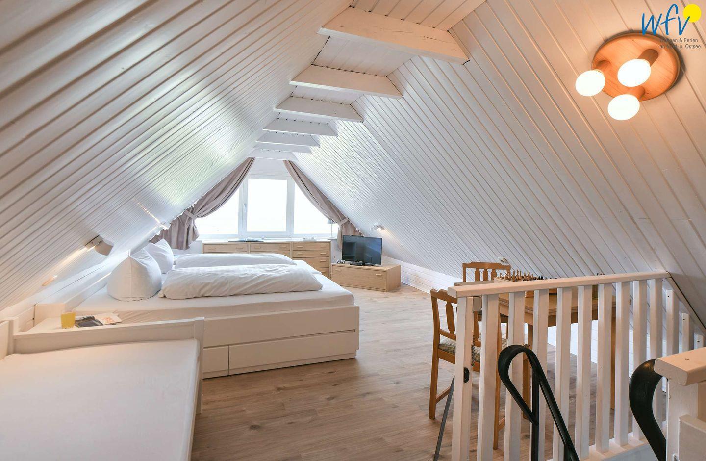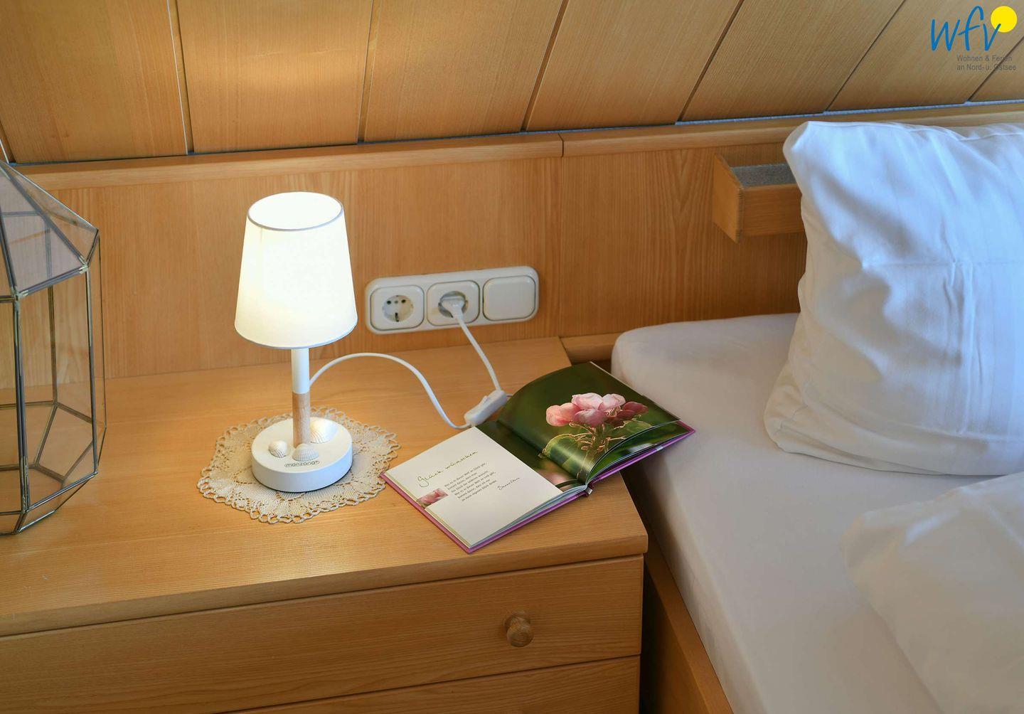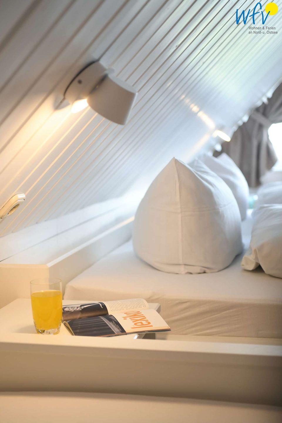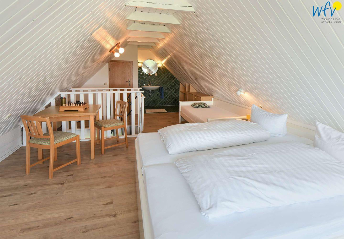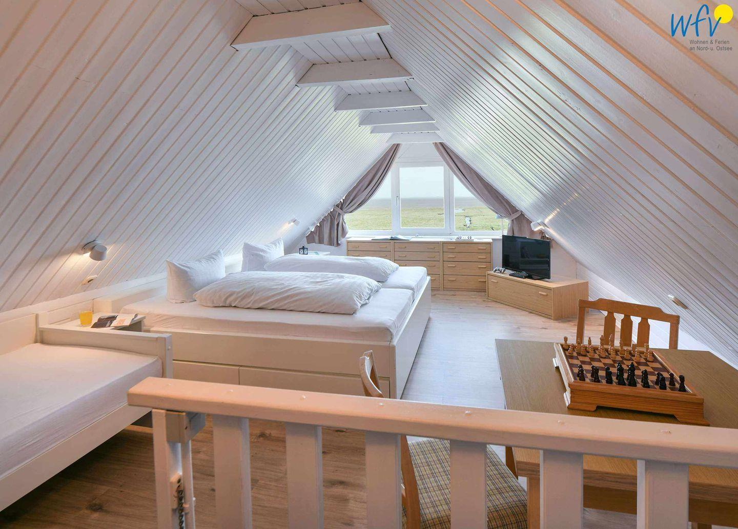 Unsere Ferienwohnung "Karin`s Nest" auf Juist ist ideal für einen Urlaub mit der Familie oder mit Freunden! Auf insgesamt 70 m² Wohnfläche erstreckt sich die Unterkunft großzügig über zwei Etagen. Im Dachgeschoss befindet sich eine gemütlich eingerichtete Schlafetage mit einem Doppelbett und einem Einzelbett (2 x 2 m bzw. 2 x 1,90 m; über eine recht steile Treppe erreichbar). Ein kleines Gästebadezimmer mit WC und ein Waschbecken im Zimmer selbst bieten zusätzlichen Wohnkomfort. Auch von dieser Etage aus haben Sie einen wunderschönen Blick auf das Wattenmeer! In der unteren Etage erwartet Sie ein weiteres separates Schlafzimmer mit Doppelbett (2 x 2 m), ein Badezimmer und ein geräumiger Wohnraum mit gemütlicher Couchecke und TV.