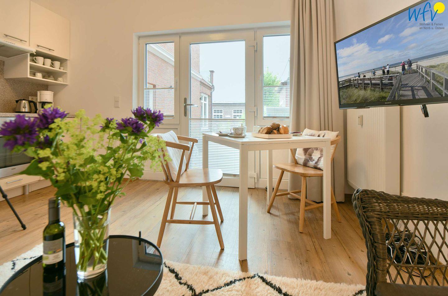 Gemütliche Ferienwohnung Sandröschen auf Juist mit sonniger Südterrasse und moderner Ausstattung für erholsame Tage.