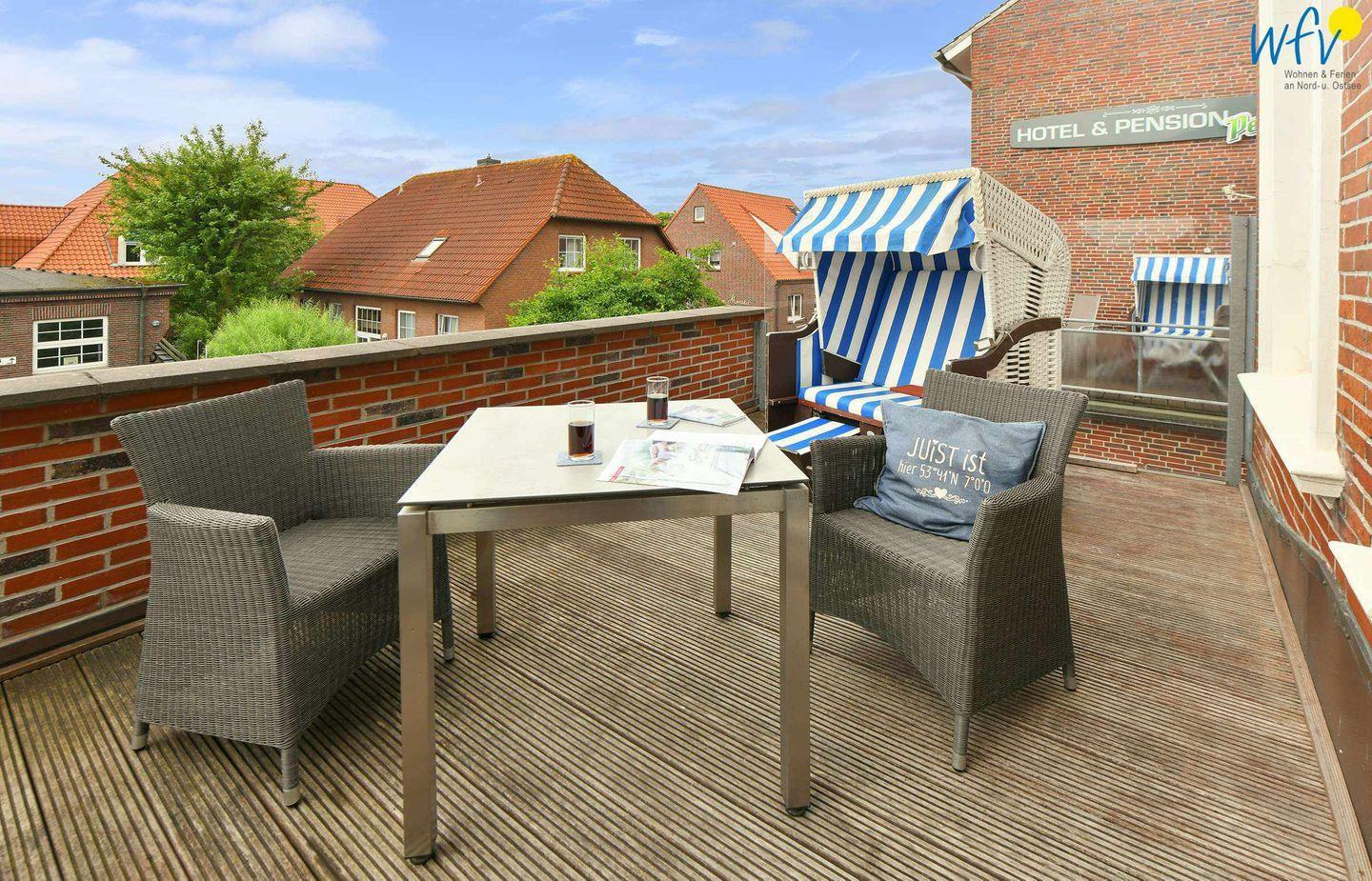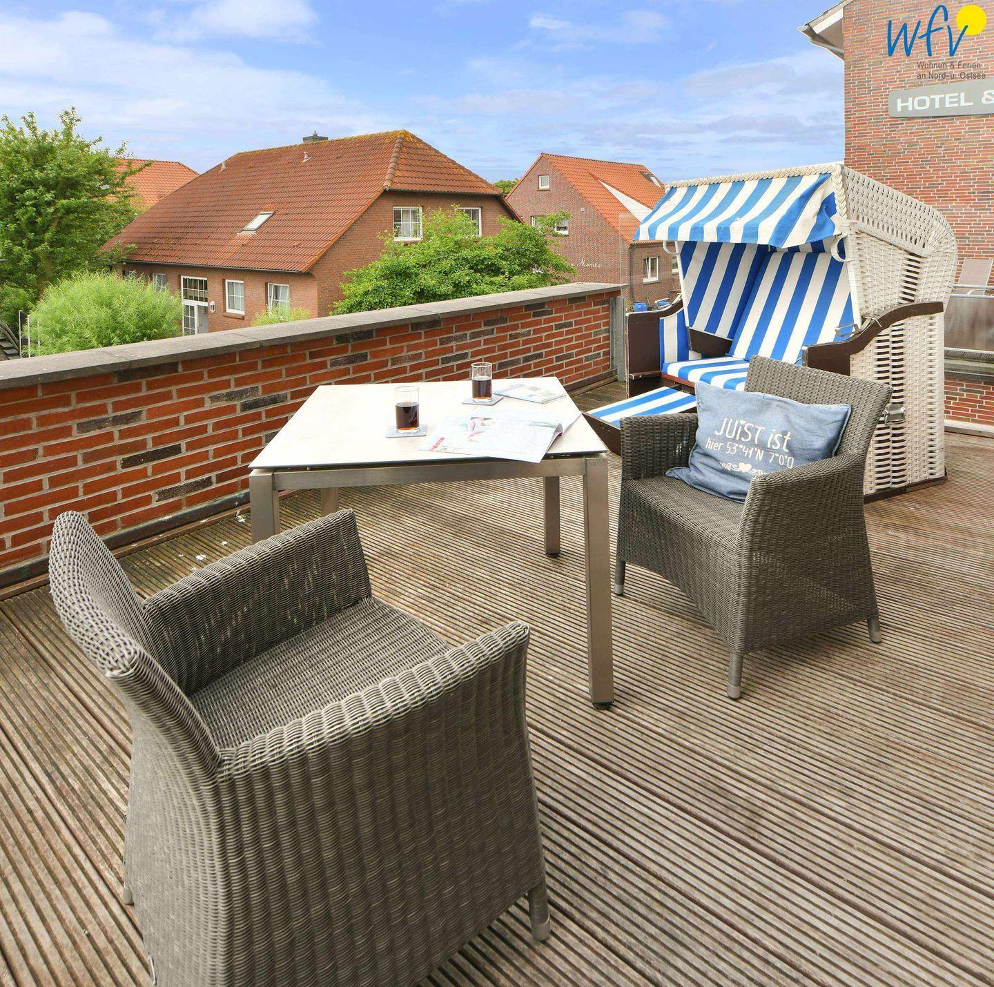 Freuen Sie sich darauf, im Urlaub in Ruhe ein gutes Buch zu lesen? Oder bei einem Glas Wein den Tag ausklingen zu lassen? Eine kleine Sitzgarnitur und ein gemütlicher Strandkorb laden auf dem Balkon tagsüber oder abends zu entspannten Stunden ein. Im Stehen haben Sie hier eine sehr schöne Aussicht auf den Hafen und das Wattenmeer.