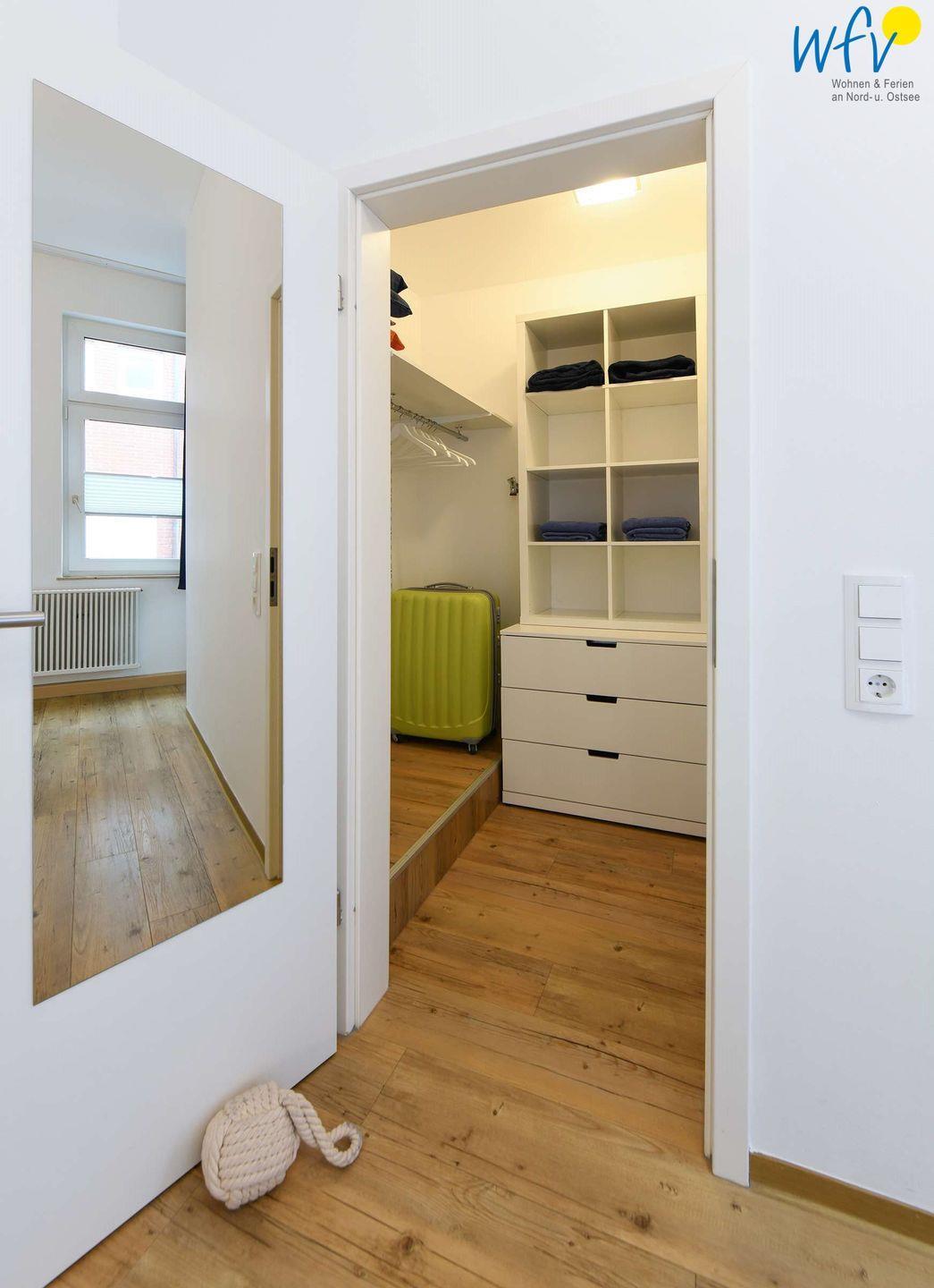 Das separate Schlafzimmer ist mit einem Doppelbett (180 x 200 cm) und einem modernen Schrankbett (90 x 200 cm) für eine dritte Person ausgestattet. Für Ihr Gepäck steht Ihnen ein begehbarer Kleiderschrank zur Verfügung.
