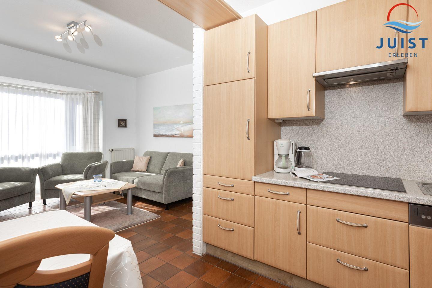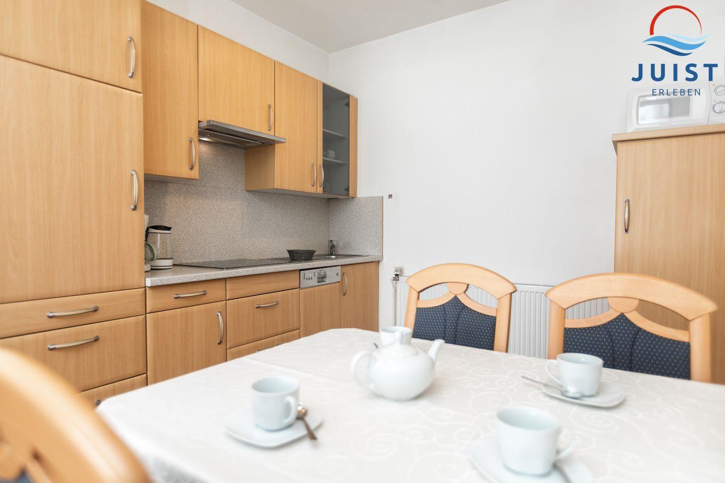 Die Küche ist mit 4-Platten-Ceranfeld, Spülmaschine, Mikrowelle, Kühlschrank mit Gefrierschrank, Kaffeemaschine und Toaster ausgestattet.