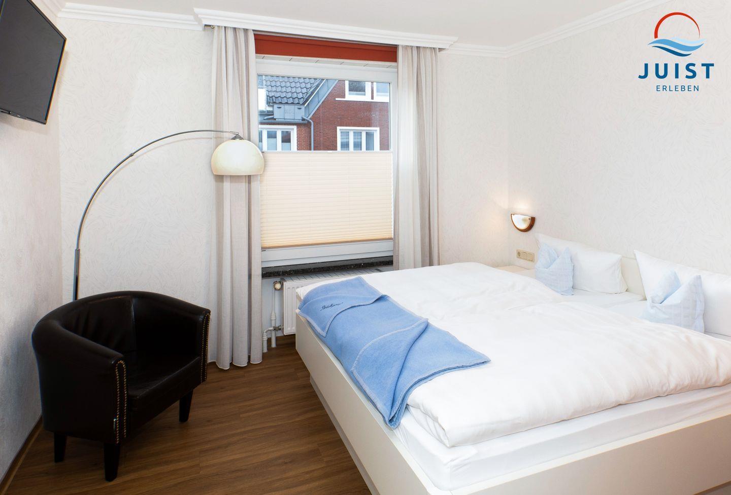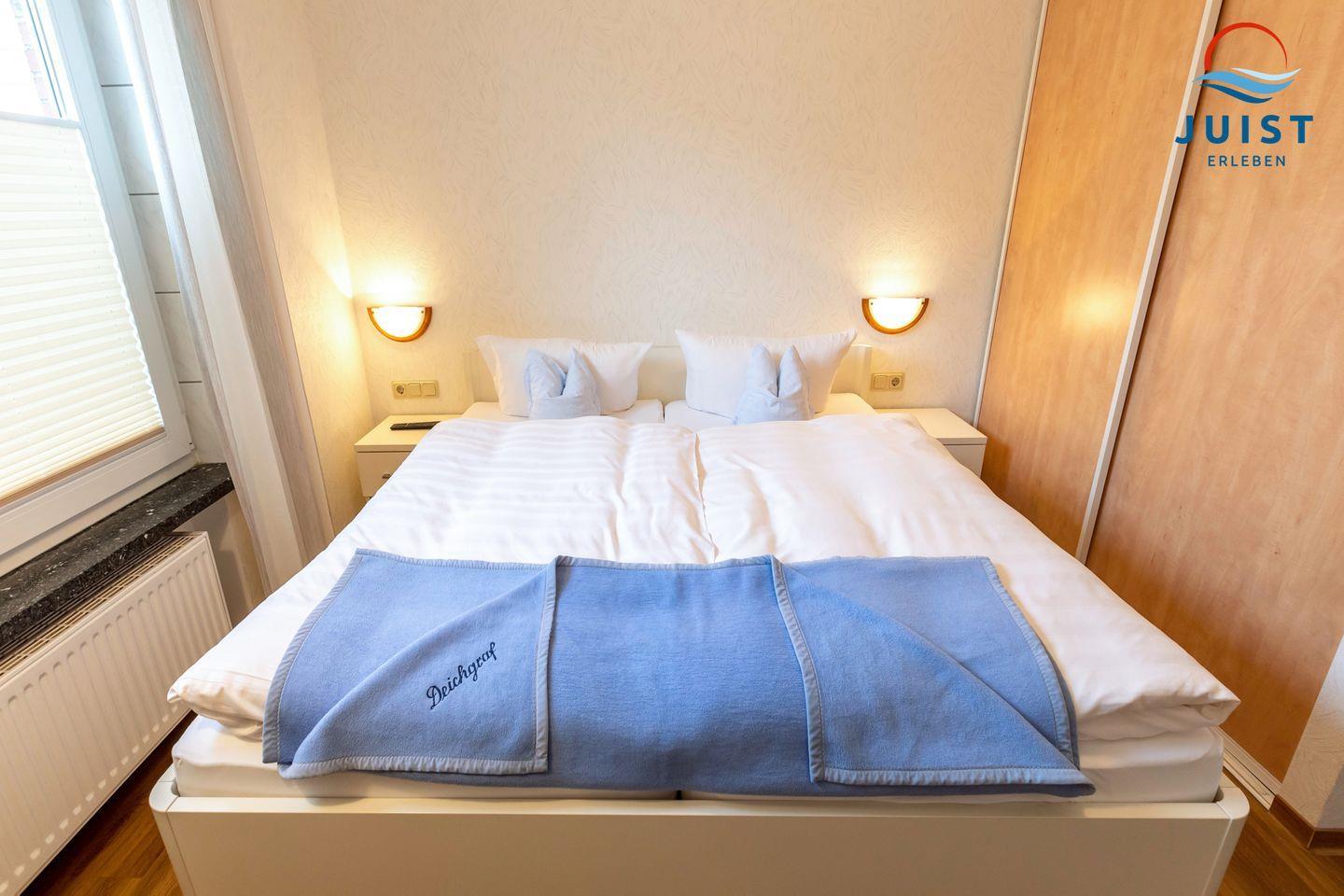 In dem separaten Schlafzimmer der Ferienwohnung befindet sich ein komfortables Doppelbett,