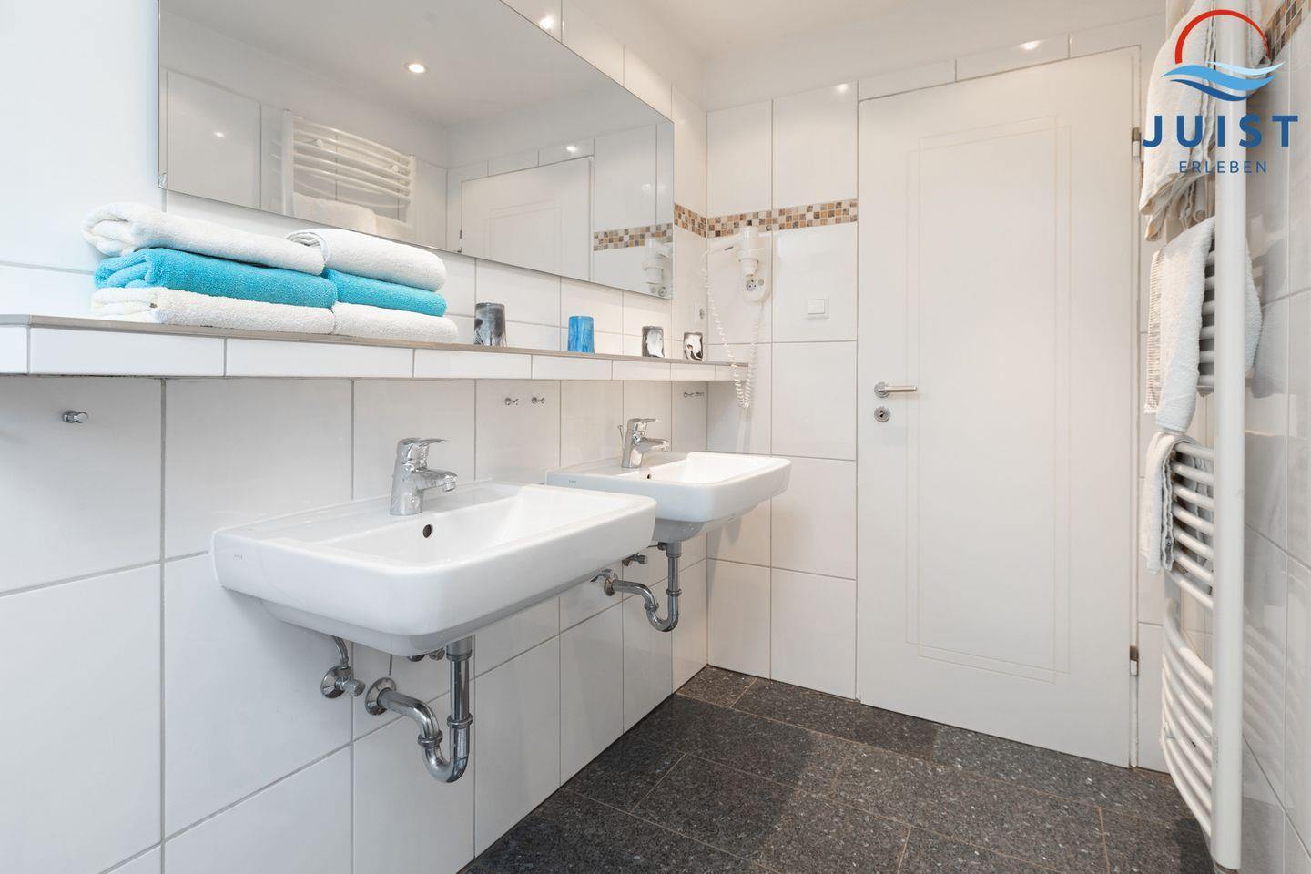Im Badezimmer befinden sich 2 Waschbecken und eine Dusche sowie ein Fenster.