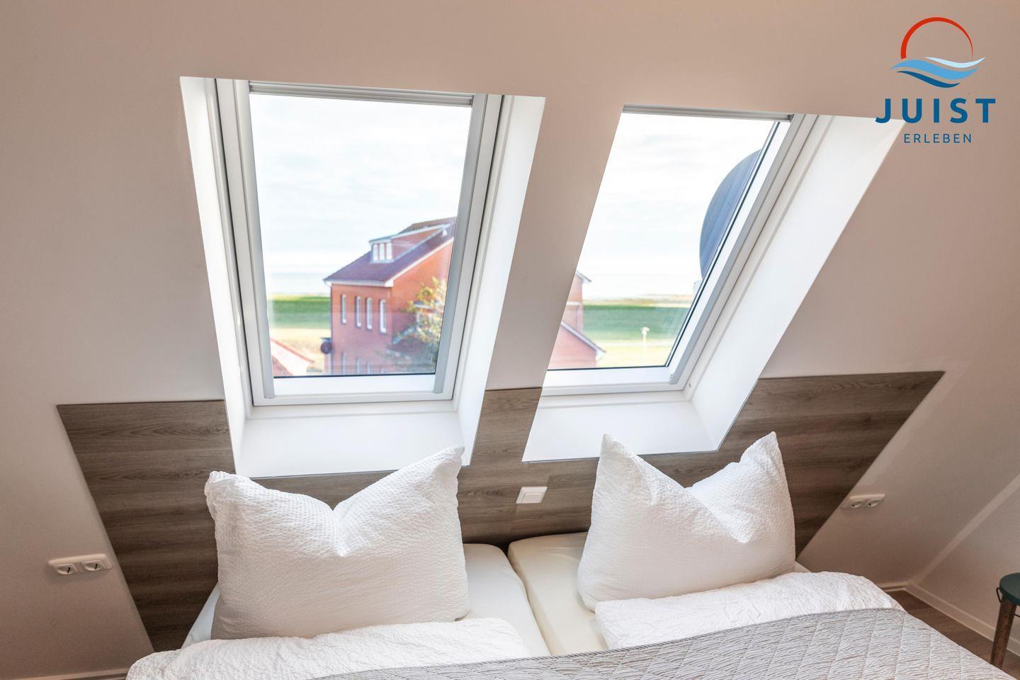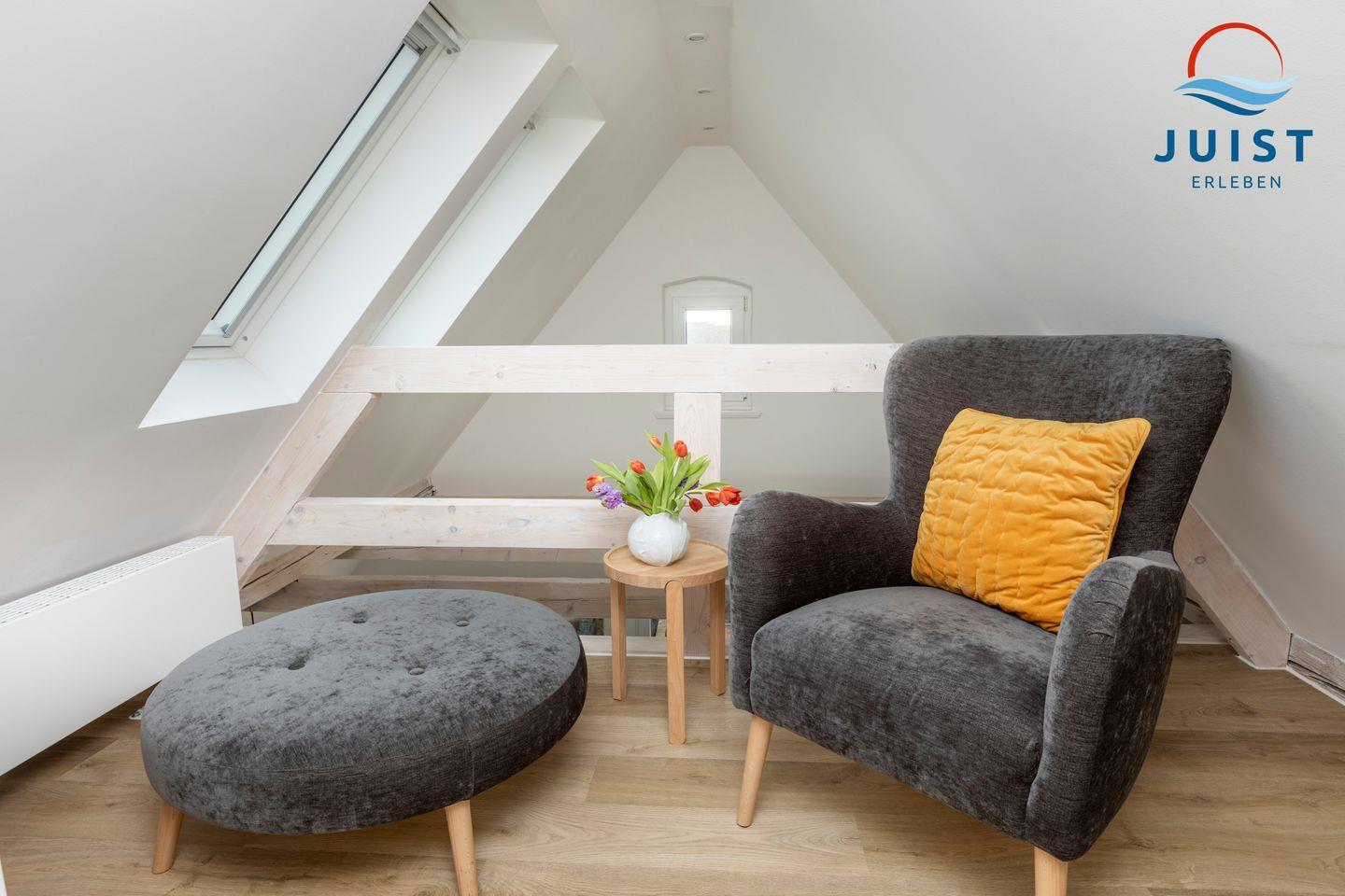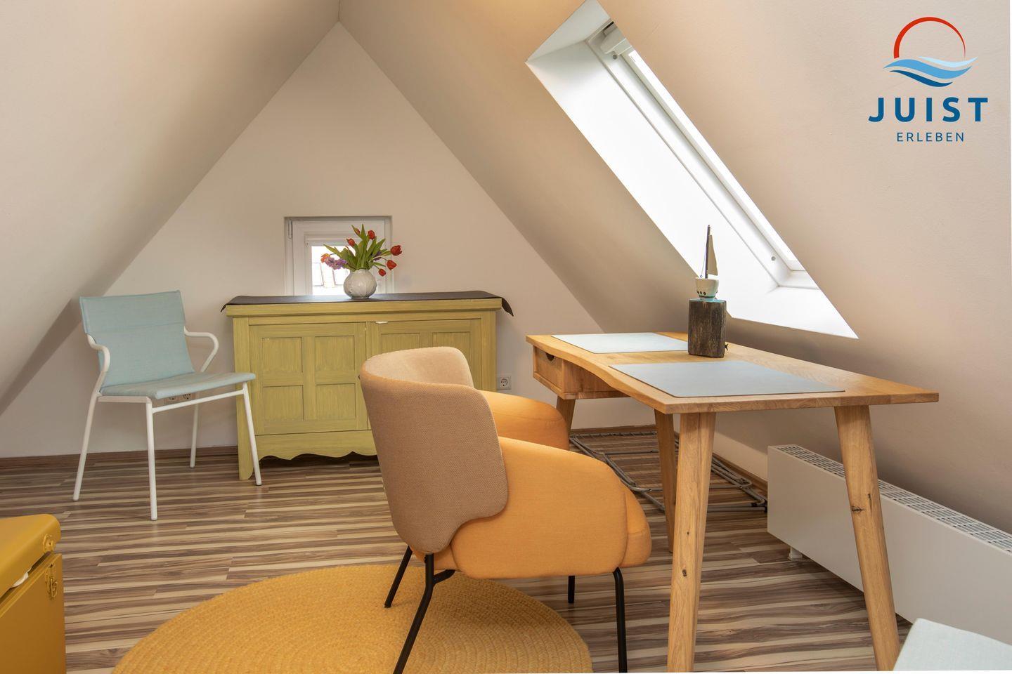 Eine Treppe führt zu Ihrem Rückzugsort mit Schreibtisch. Angrenzend haben Sie von einer offenen loftartigen Leseecke einen tollen Blick aufs Wattenmeer. Hier können Sie einfach nur Entspannen.