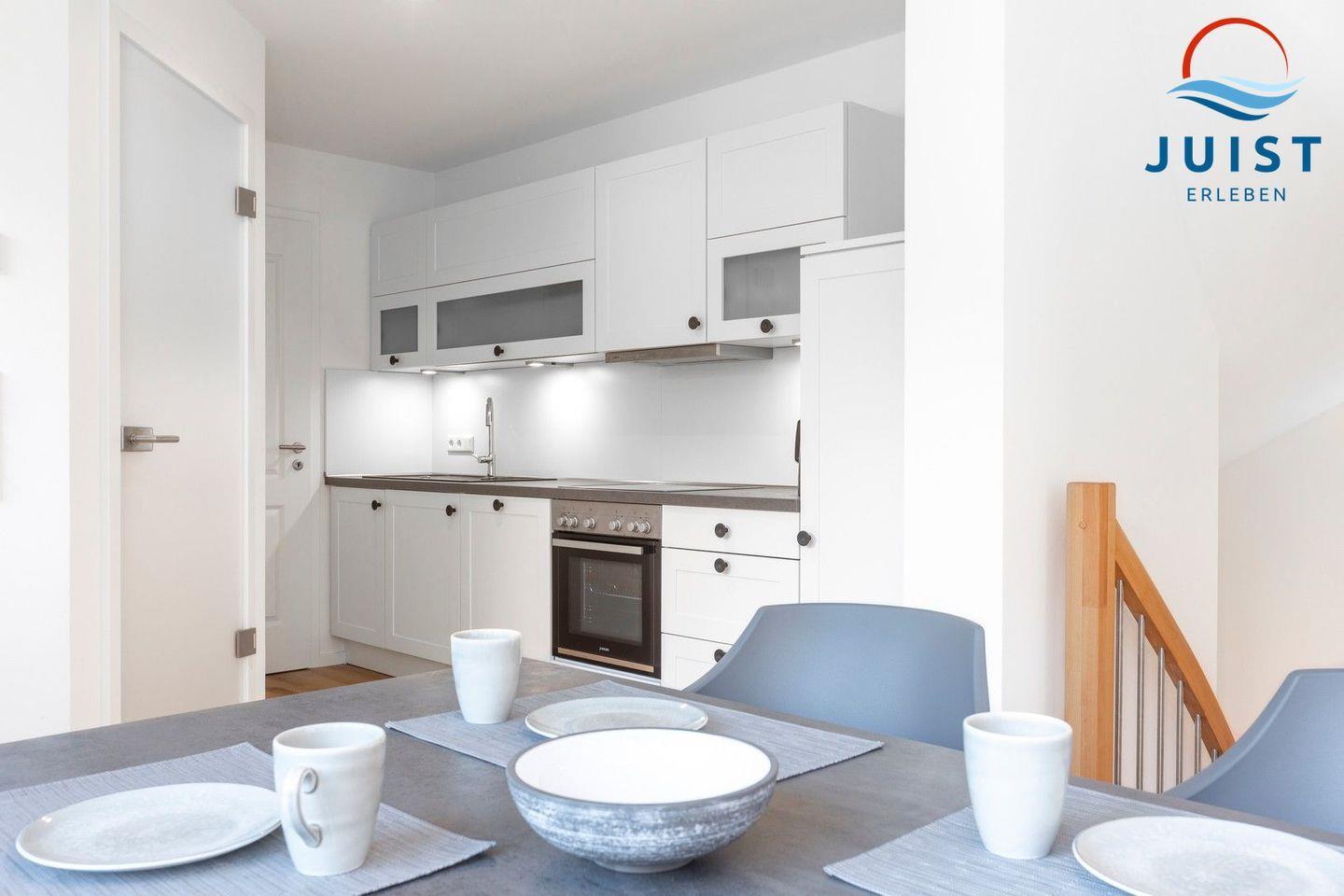 Die moderne Einbauküche verfügt u.a. über einen 4- Platten Herd sowie Backofen, Geschirrspüler, Kühlschrank, Kaffeemaschine, Wasserkocher und Toaster - so lassen sich auch im Urlaub schnell und einfach Gerichte zubereiten.