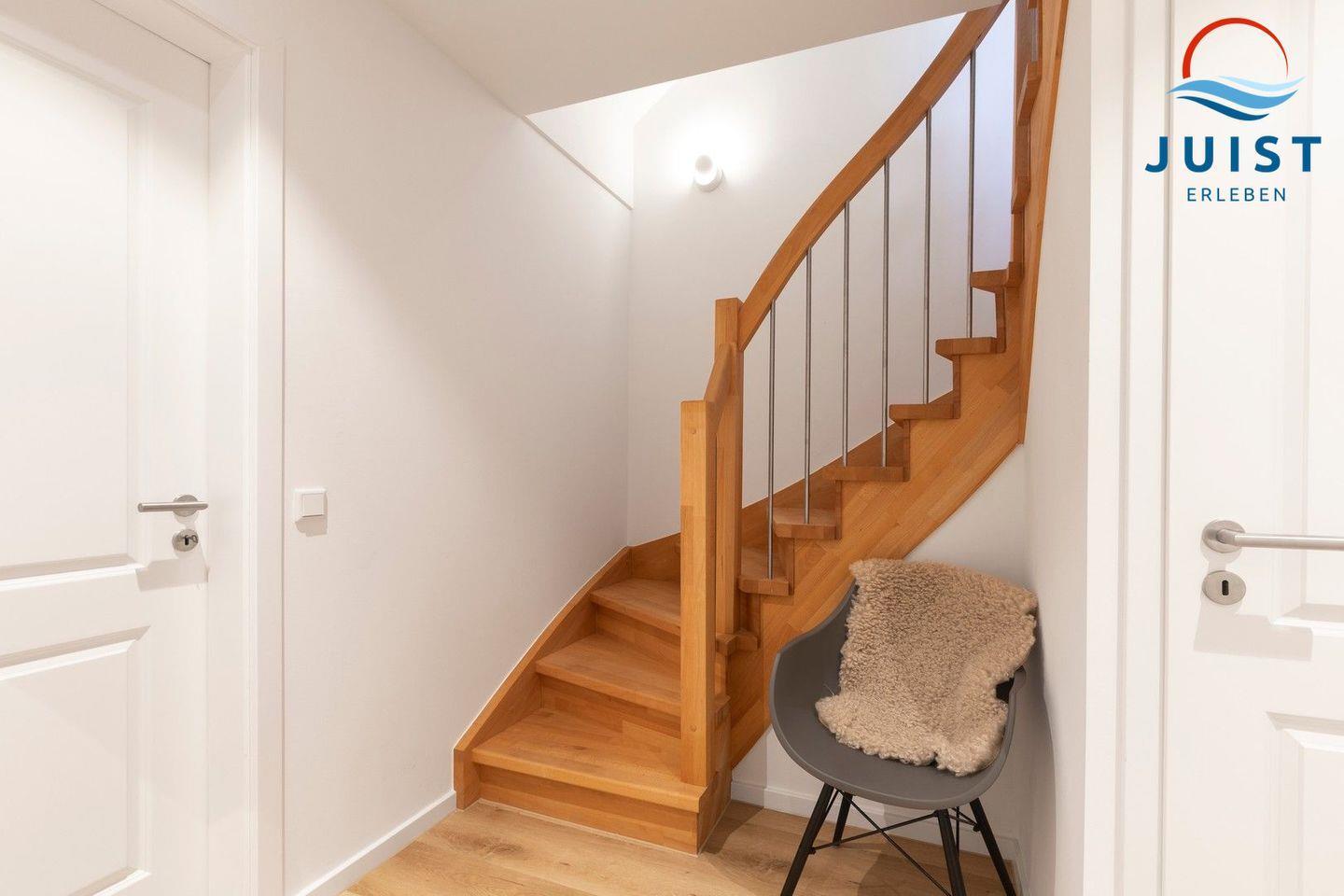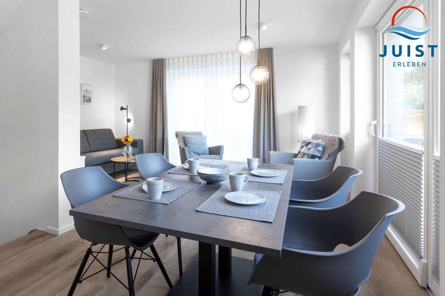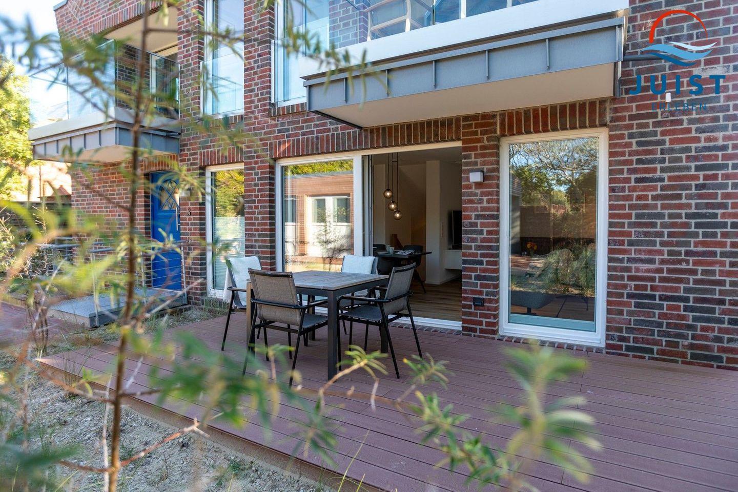 Moderne Ferienwohnung in Juist mit Terrasse, zwei Schlafzimmern und Nähe zum Watt, ideal für Familien und Hunde.