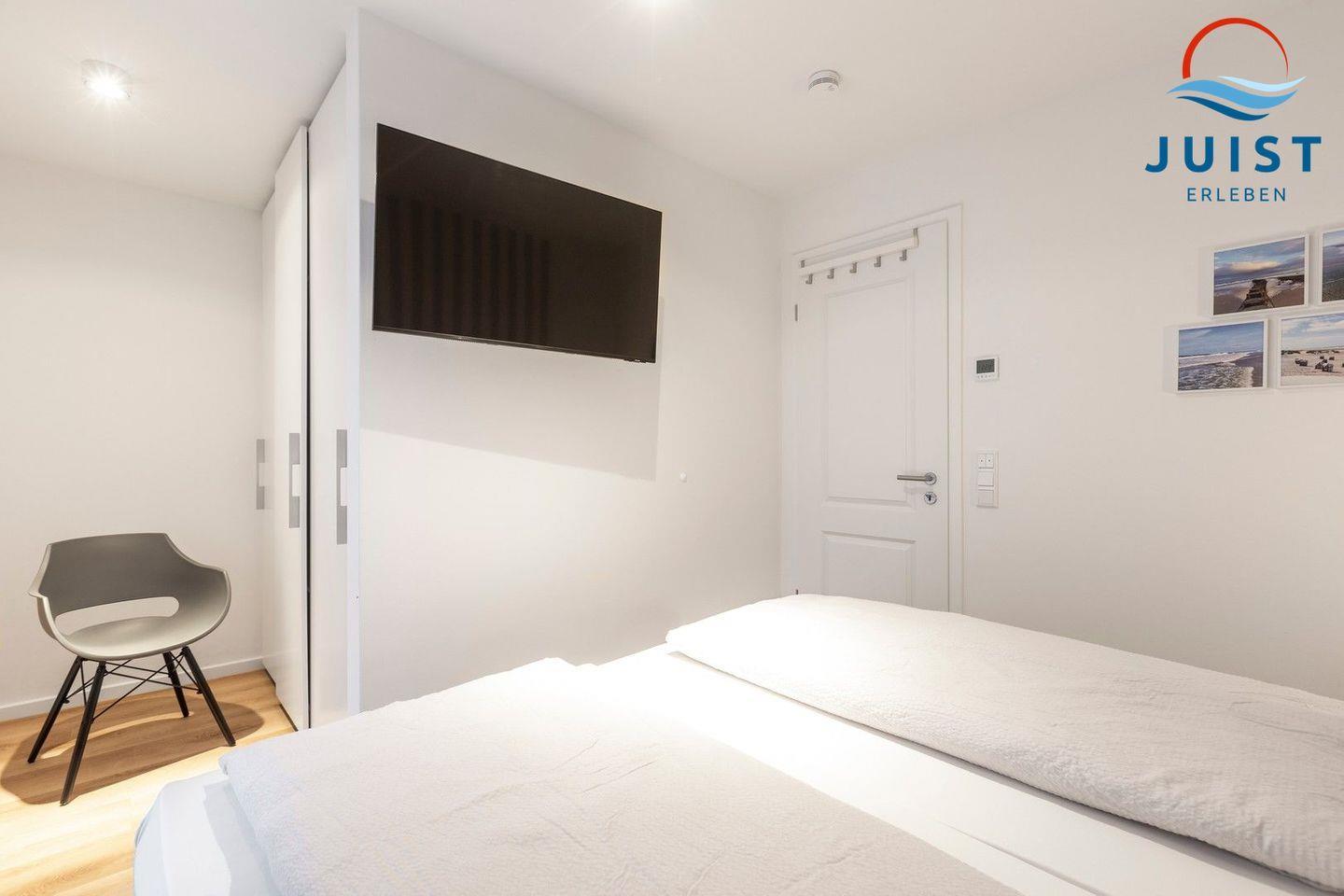 Die zwei separaten Schlafzimmer sind mit einem Doppelbett und einem TV sowie einem großen Kleiderschrank eingerichtet.