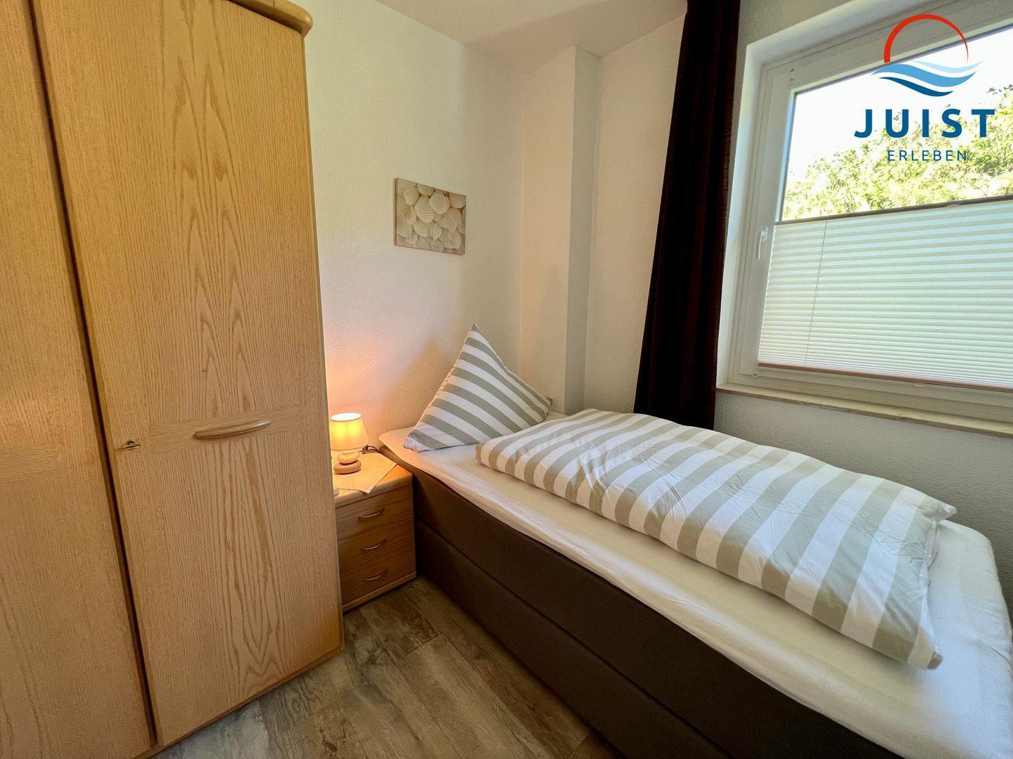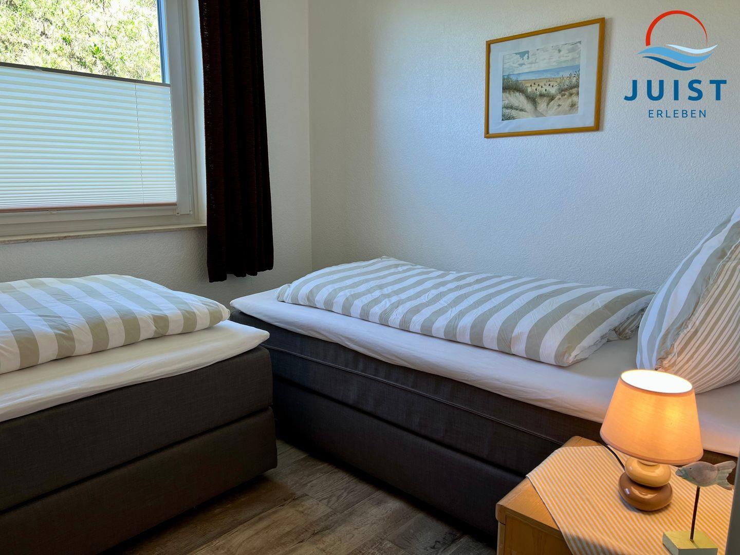 Im Schlafzimmer befinden sich zwei Einzelbetten sowie ein Kleiderschrank.