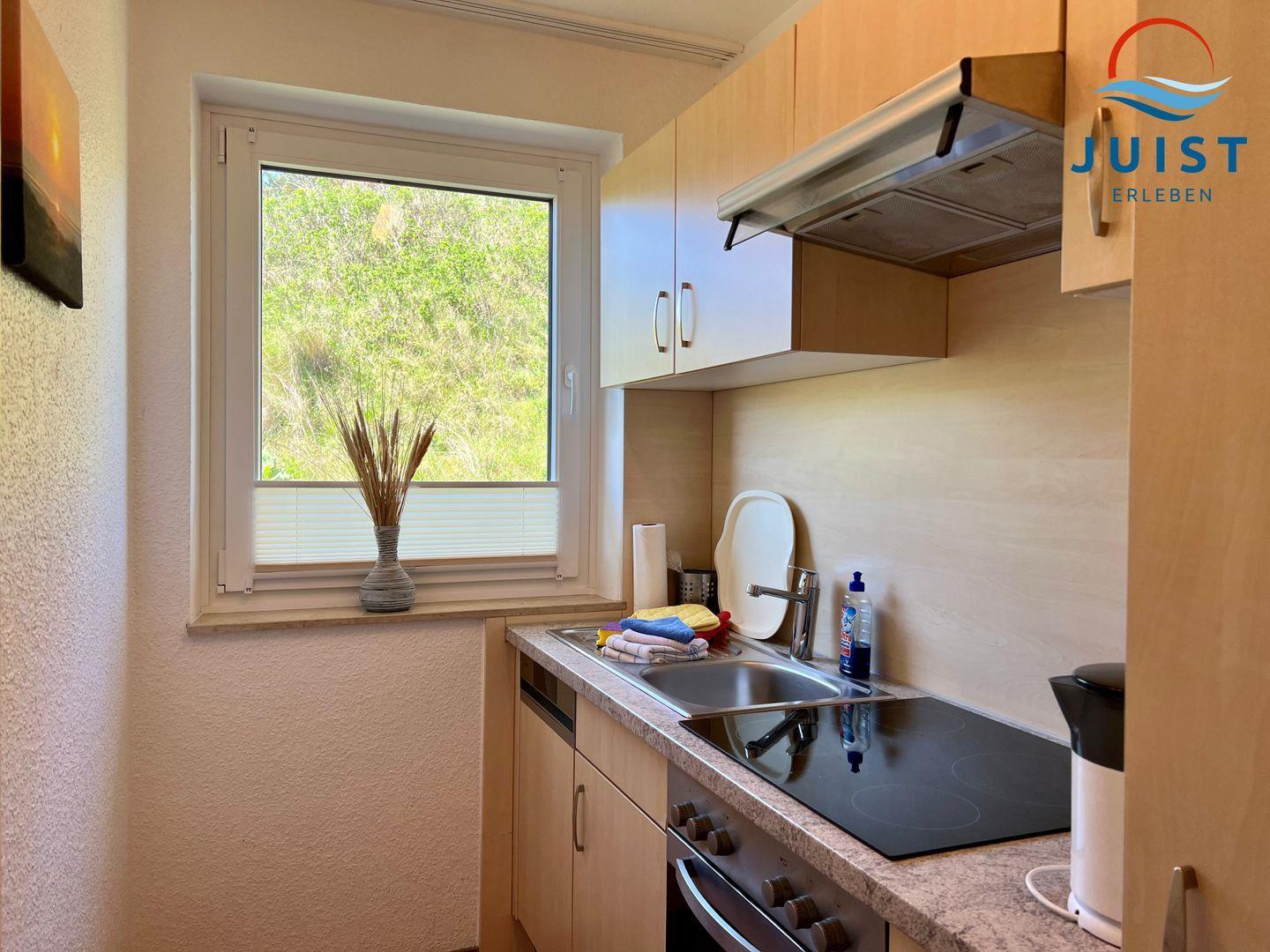 Damit Sie sich in Ihrem Urlaub auf Juist bequem selbst versorgen können, verfügt die separate Küche unter anderem über einen 4-Platten-Ceran-Herd, einen Kühlschrank mit Gefrierfach, eine Geschirrspülmaschine, einen Toaster, einen Eierkocher und eine Kaffeemaschine.