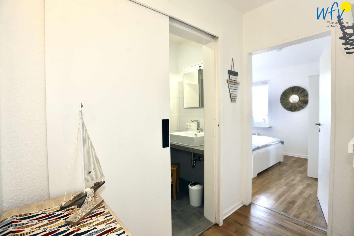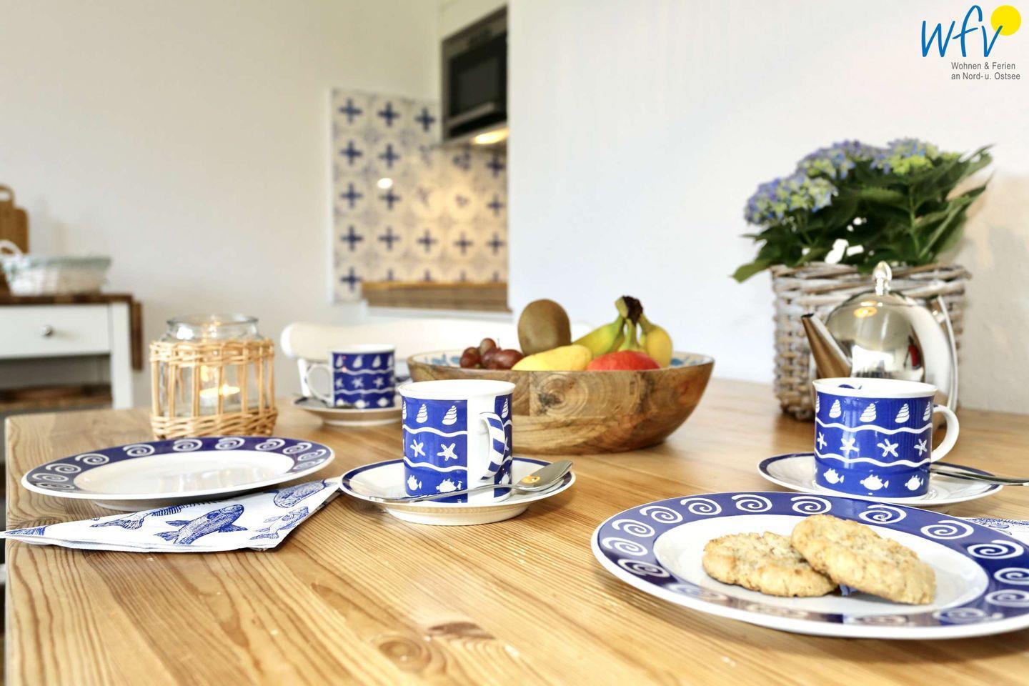 Im hellen Wohnraum empfängt Sie eine einladende Einrichtung in harmonischen Farben; maritime Accessoires sorgen für schönes Flair und das entsprechende Nordseegefühl! Am Esstisch lassen sich bereits beim entspannten Ferienfrühstück tolle Pläne für den Urlaubstag machen. Und während einer von Ihnen den Rucksack für den Ausflug packt, kann in der offenen Küche mit 2-Platten-Induktionsherd und Mikrowelle der leckere Proviant für unterwegs zubereitet werden.