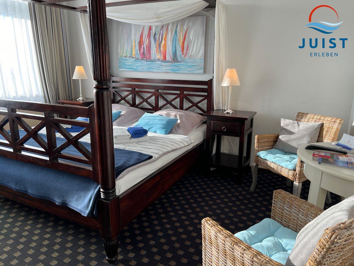 Gemütliches Doppelzimmer mit Himmelbett und Wattenmeerblick auf Juist, ideal für erholsame Tage zu zweit.