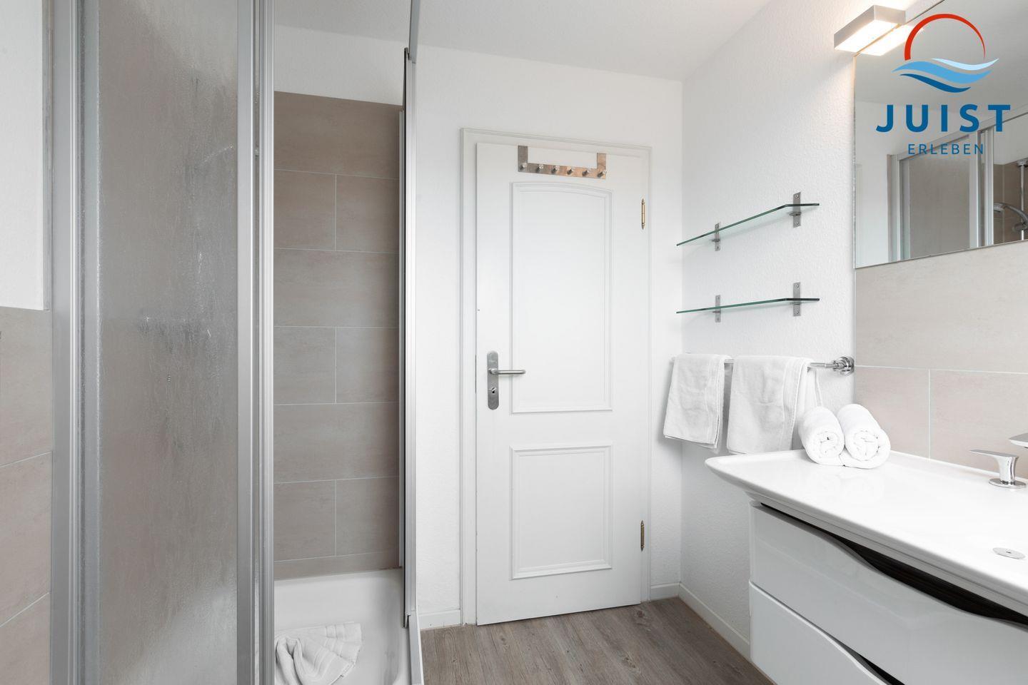 Beide modernen Badezimmer mit Dusche sind vom Flur ausgehend zugänglich.