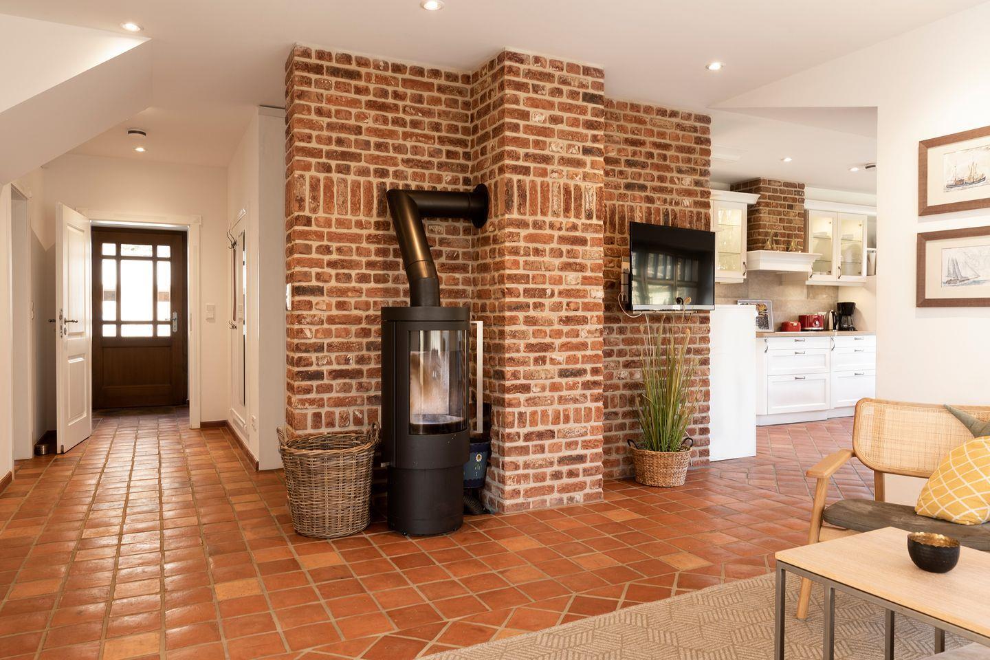 Der Wohnraum mit Kamin grenzt an die offene Wohnküche. Diese ist mit einem 4-Felder Ceranherd und Backofen, Kühlschrank mit TK-Fach, Geschirrspüler, Wasserkocher, Toaster, Filterkaffeemaschine und Küchentüchern ausgestattet.