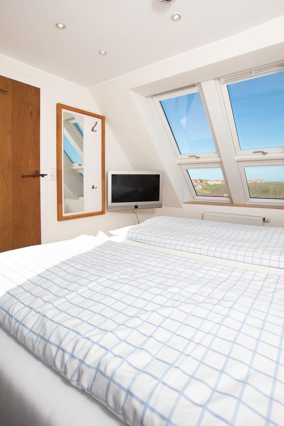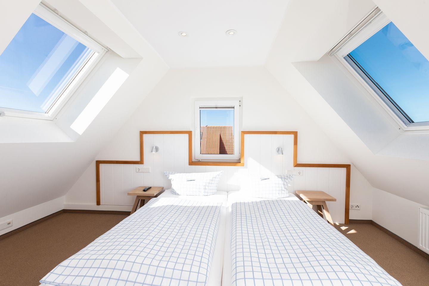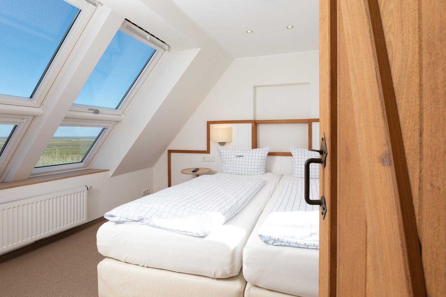 Im unteren Schlafraum mit Doppelbett kann bei Bedarf ein Zustell-Kinderbett bereitgestellt werden. Im Dachspitz lässt sich das Doppelbett des Schlafzimmers wahlweise auch in zwei Einzelbetten umfunktionieren.