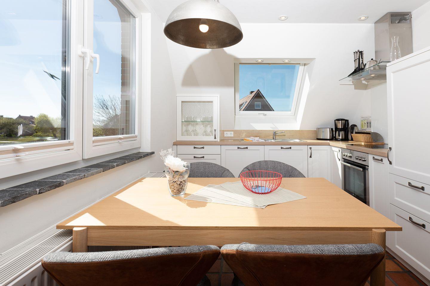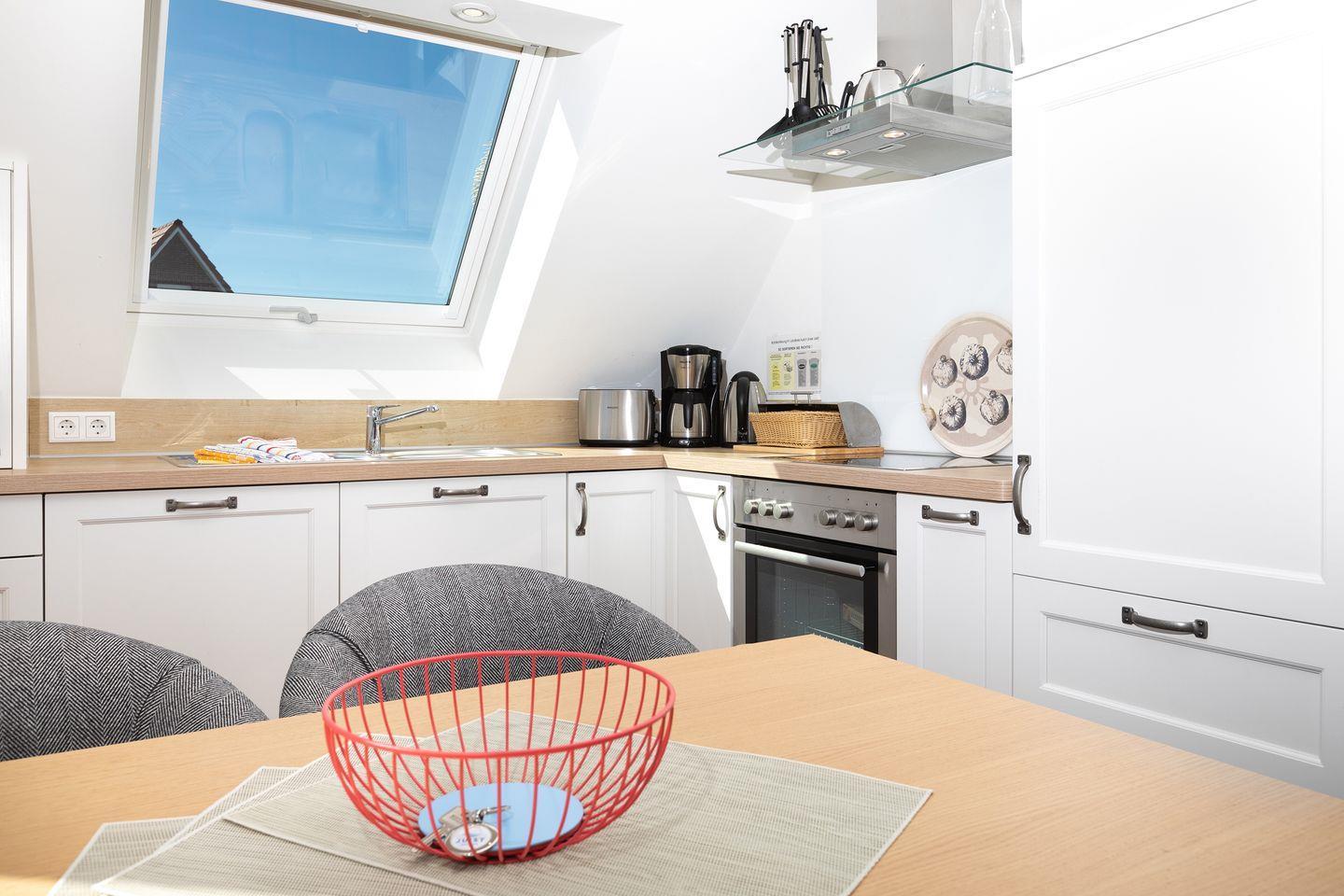 Herzstück ist die offene Wohnküche, auf die von drei Seiten Licht einfällt und gemütlich eingerichtet ist. Die Küchenzeile ist mit 4-Felder Ceranherd und Backofen, sowie Kühlschrank mit TK-Fach, Spülmaschine, Toaster, Kaffeefiltermaschine und Küchentüchern ausgestattet.