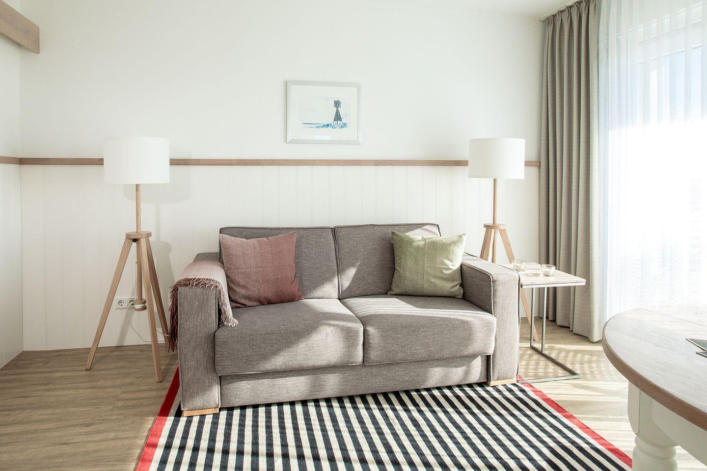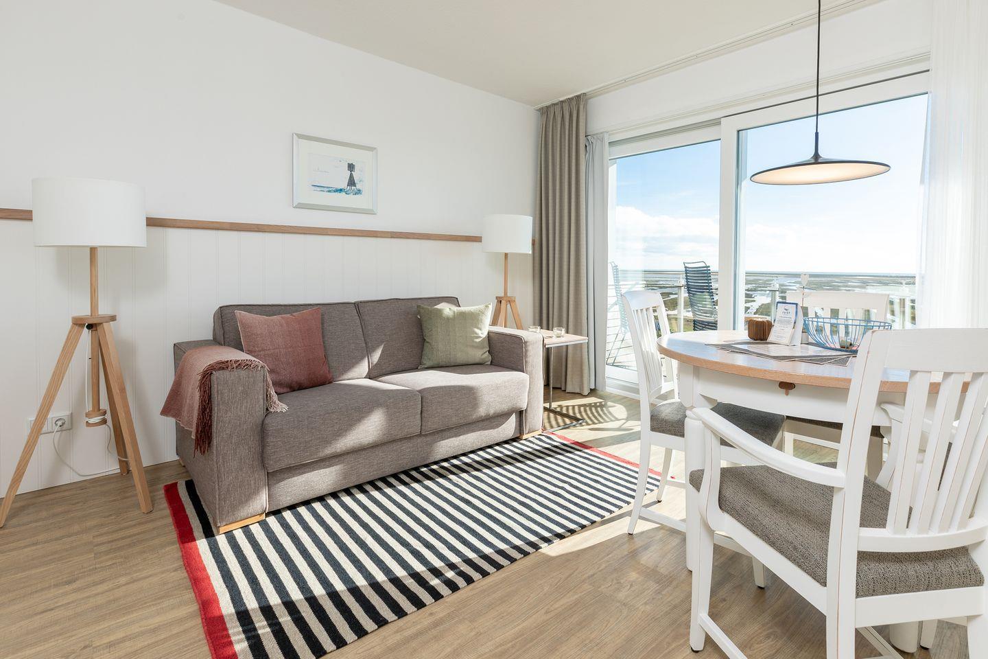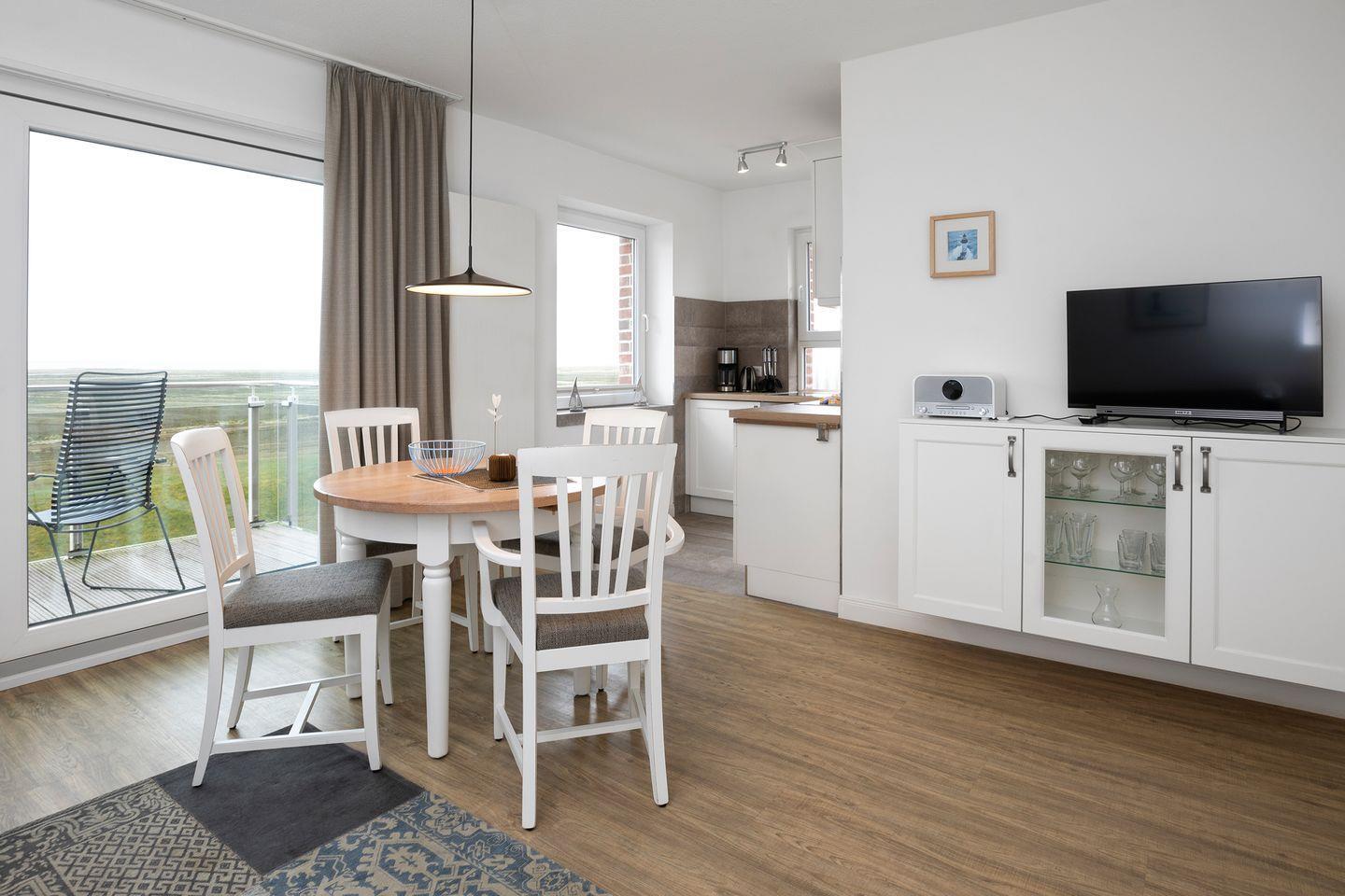 Ferienwohnung Steuerbord auf Juist mit Balkon, Meerblick und moderner Küche, ideal für 1-2 Personen.