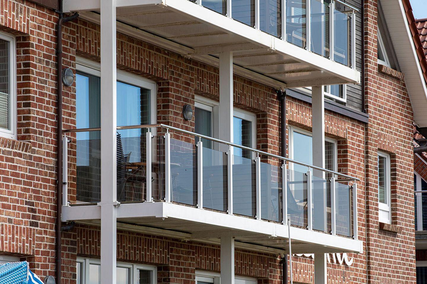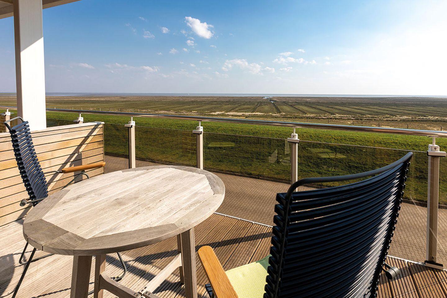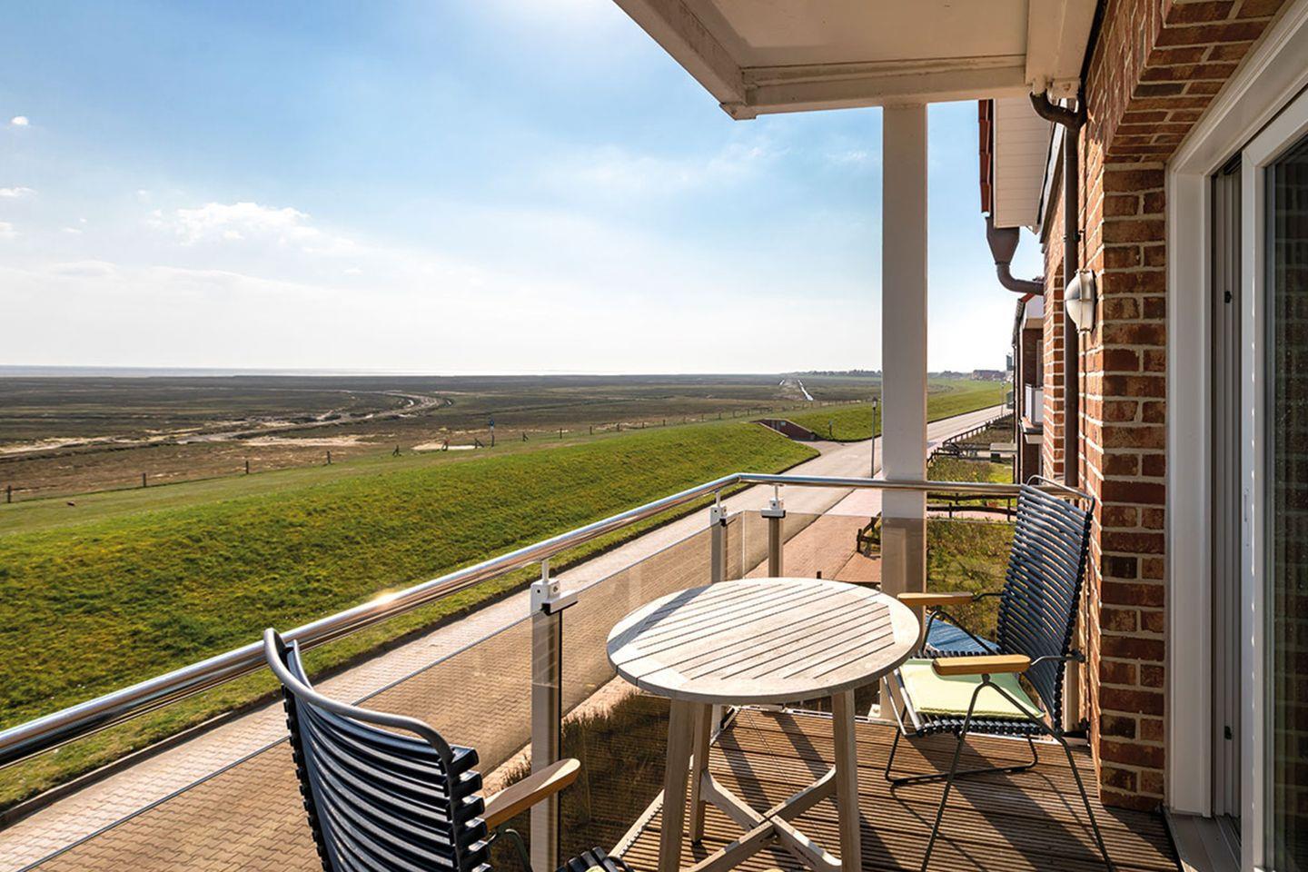 Mit einer Fläche von ca. 5m² bietet der südseitige Balkon einen Blick über Hellerwiesen und Wattenmeer.