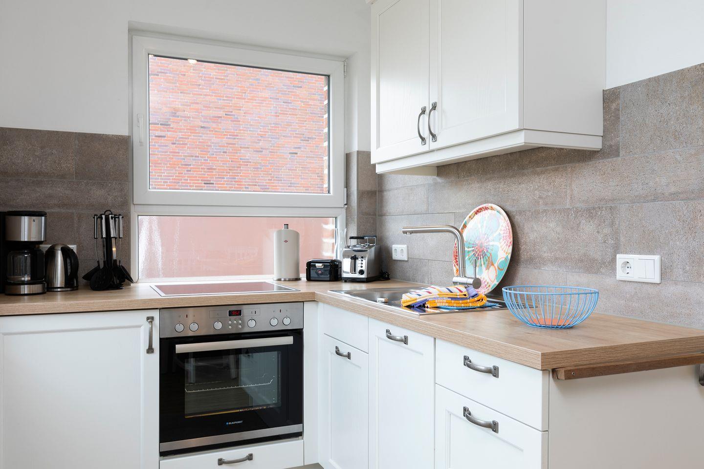 Der Wohn-Essbereich verfügt über eine angrenzende Küchenzeile, welche mit einem 4-Felder Ceranherd, Backofen, Kühlschrank mit TK-Fach, Geschirrspüler, Wasserkocher, Toaster, Filterkaffeemaschine und Küchentüchern ausgestattet ist.
