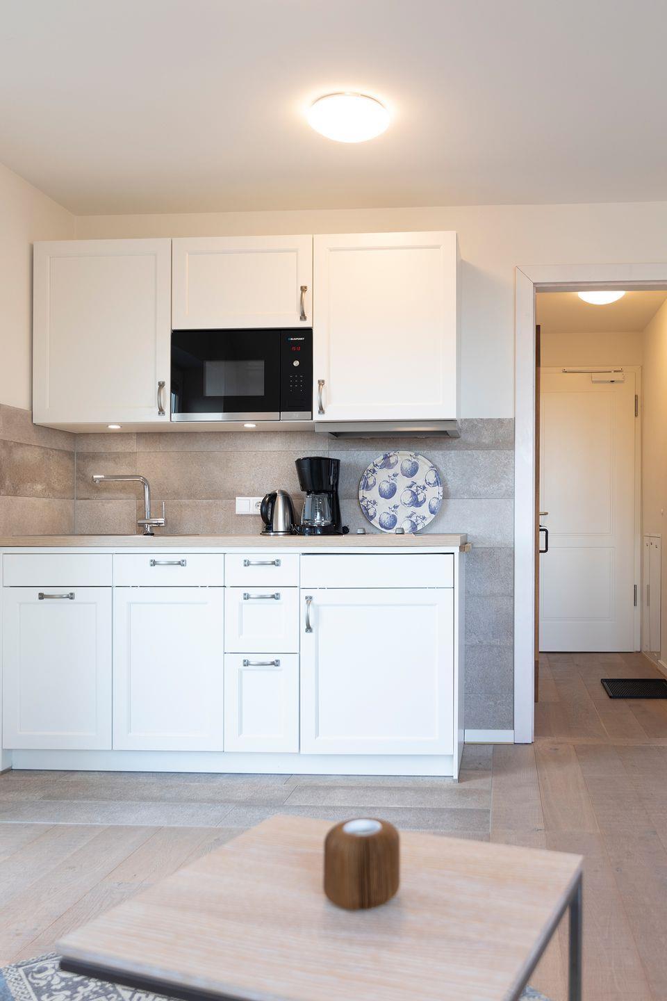 An den offenen Wohn-Essbereich schliesst sich die Küchenzeile an. Diese umfasst einen Herd mit 2 Ceranfeldern, Mikrowelle, Kühlschrank mit TK-Fach, Geschirrspüler, Wasserkocher, Toaster, Filterkaffeemaschine und Küchentüchern.