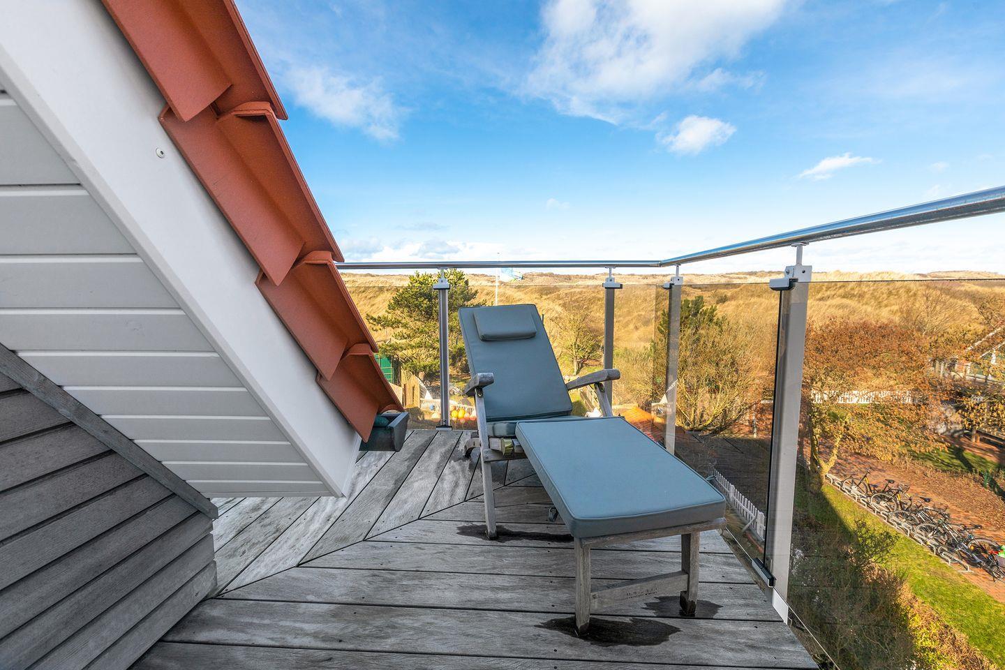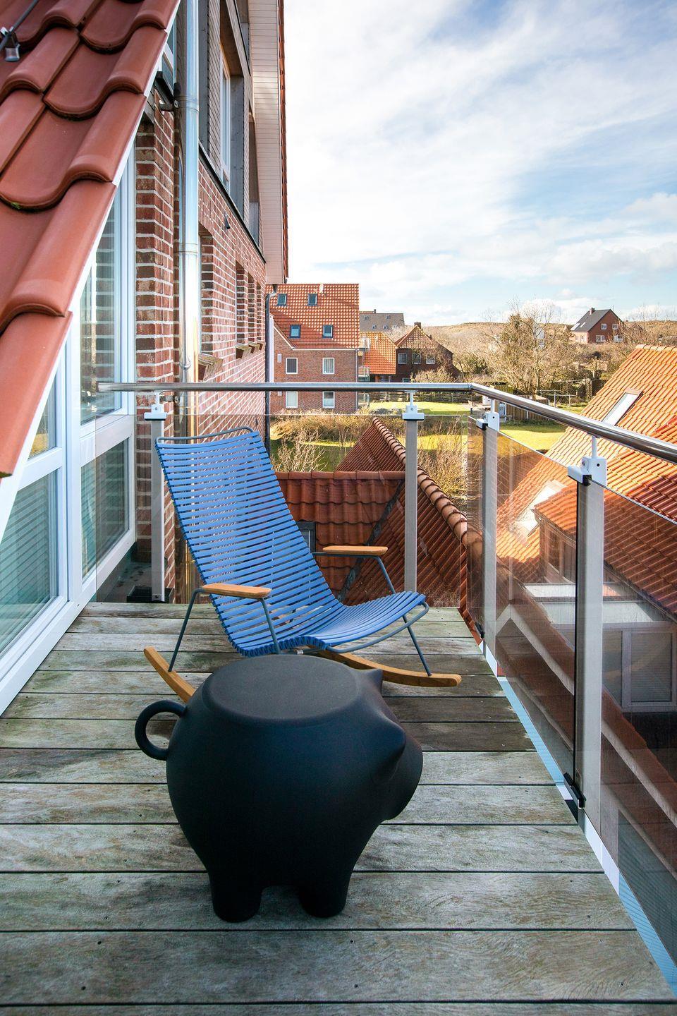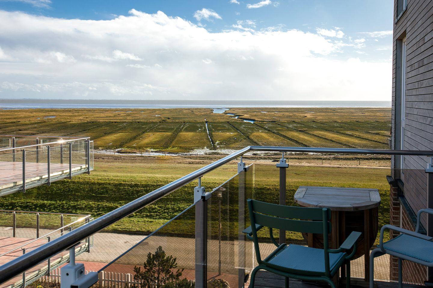 Der Eckbalkon der Wohnung „Lee“ liegt zur Nord-Ost-Seite mit einer Fläche von ca. 9m². Von hier blickt man gleichermaßen in Watt und Dünen.