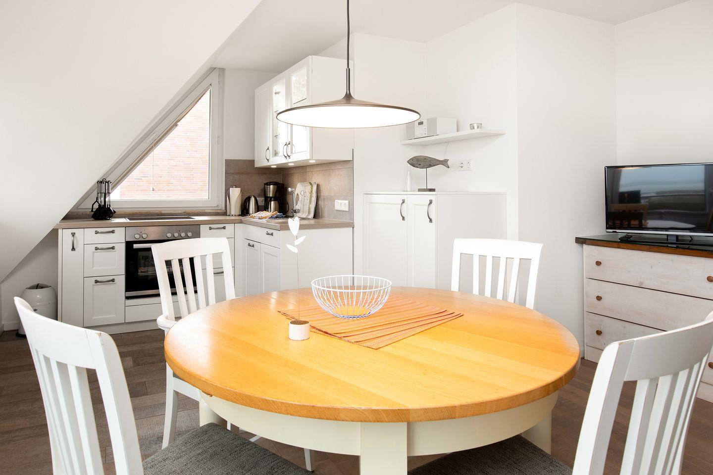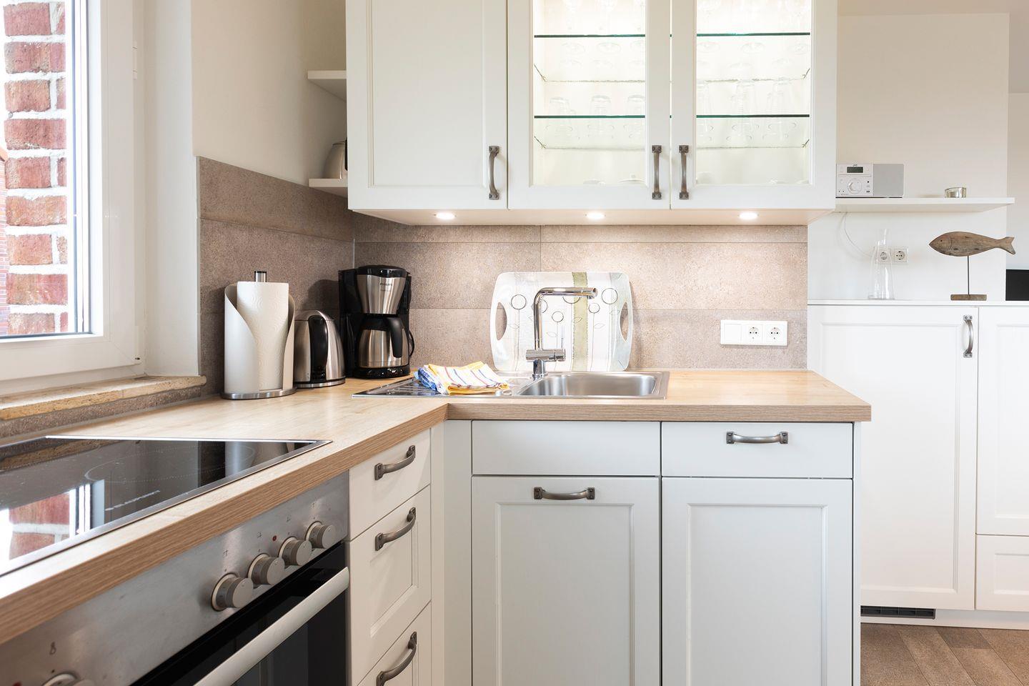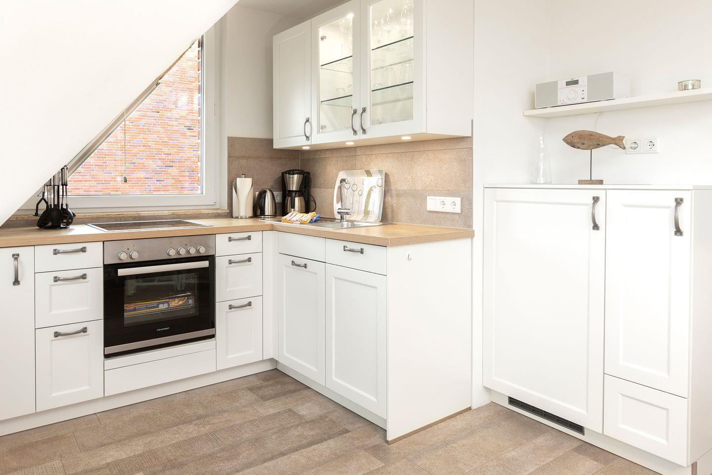 Der Wohn-Essbereich verfügt über eine angrenzende Küchenzeile, welche mit einem 4-Felder Ceranherd, Backofen, Kühlschrank mit TK-Fach, Geschirrspüler, Wasserkocher, Toaster, Filterkaffeemaschine und Küchentüchern ausgestattet ist.