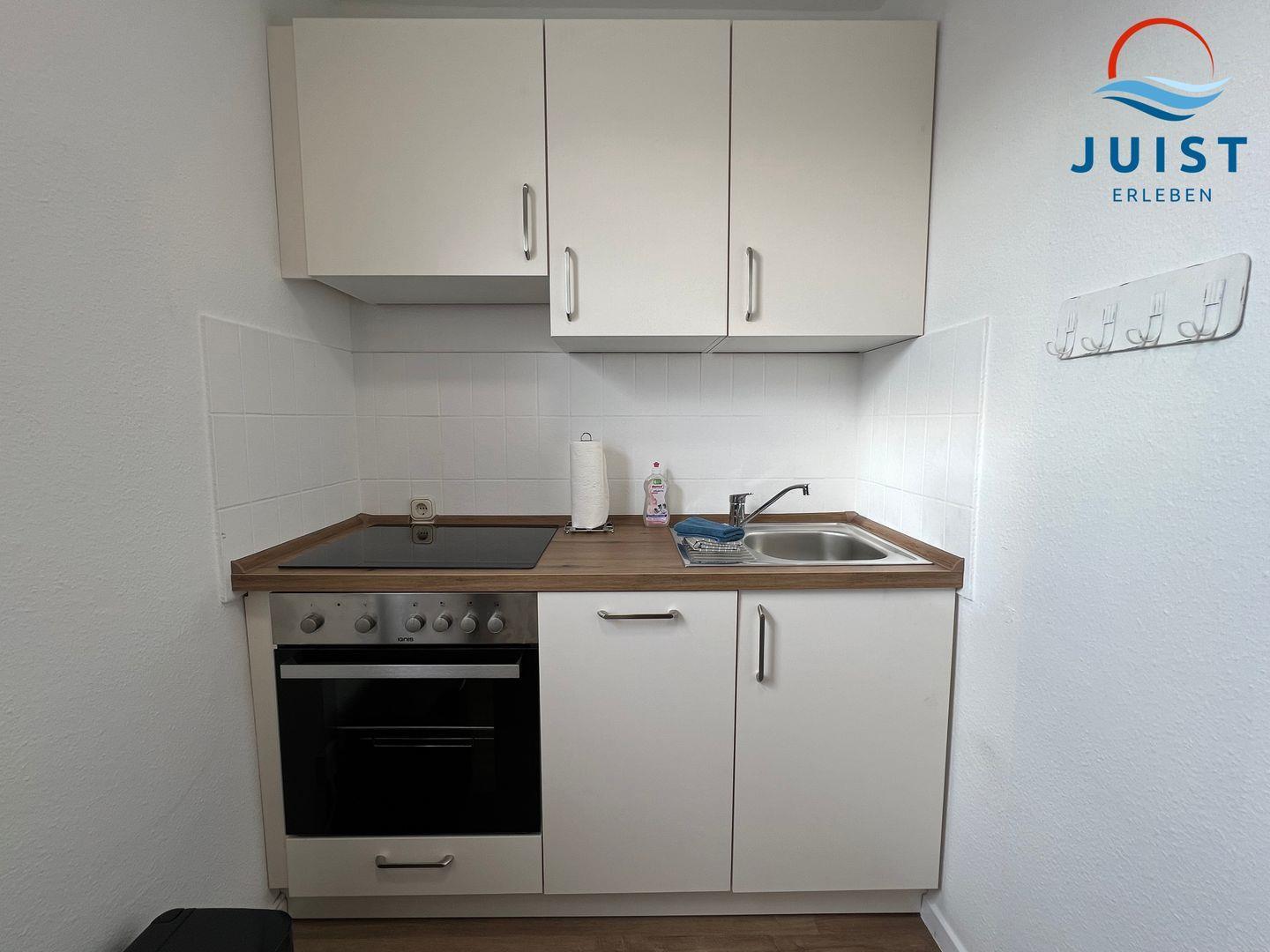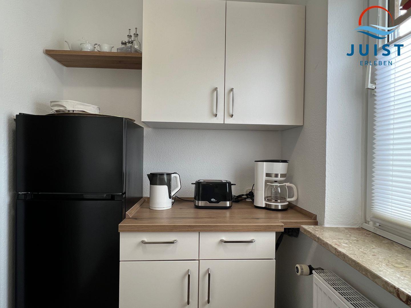 Damit Sie sich in Ihrem Urlaub auf Juist bequem selbst verpflegen können, verfügt die Küchenzeile u.a. über einen Herd, einen Kühlschrank sowie über eine Kaffeemaschine, einen Wasserkocher und einen Toaster.