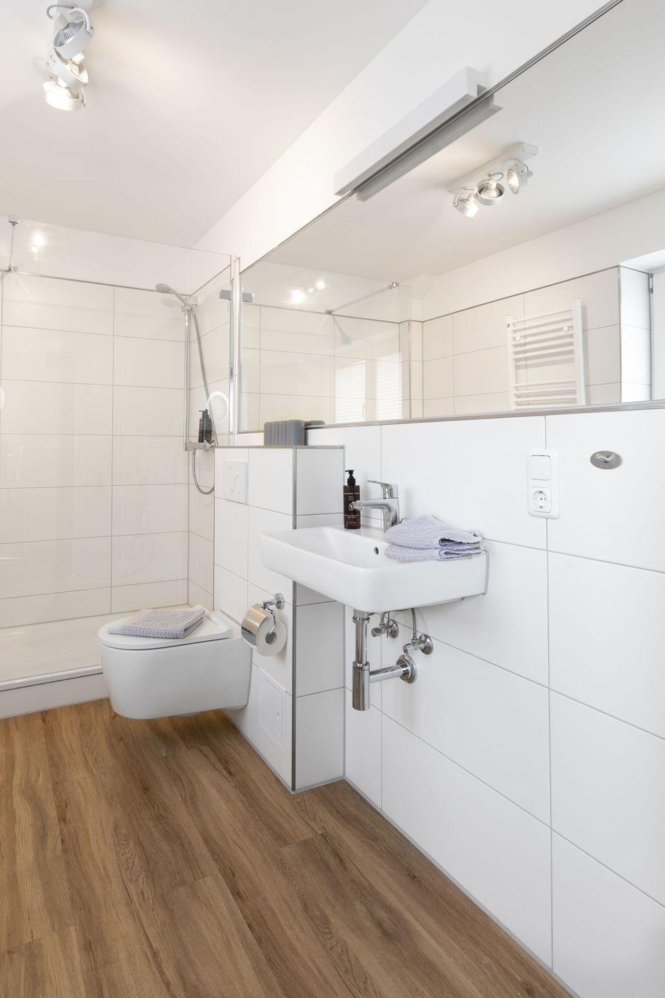 Das Badezimmer mit Fenster bietet eine große, ebenerdige Dusche sowie Waschbecken und WC. Seife, Duschgel und Shampoo stehen für Sie bereit. Zwei zusätzliche ostfriesische Schlafkojen in Form eines Etagenbettes befinden sich abseits vom Wohnraum.