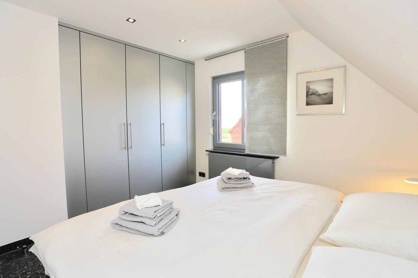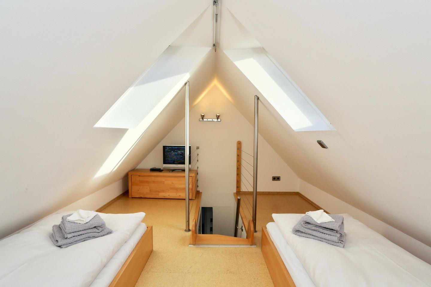 Im Schlafzimmer unter dem Spitzdach finden Sie zwei Einzelbetten im Schlafzimmer in der unteren Etage befindet sich ein komfortables Doppelbett (180 x 200 cm).