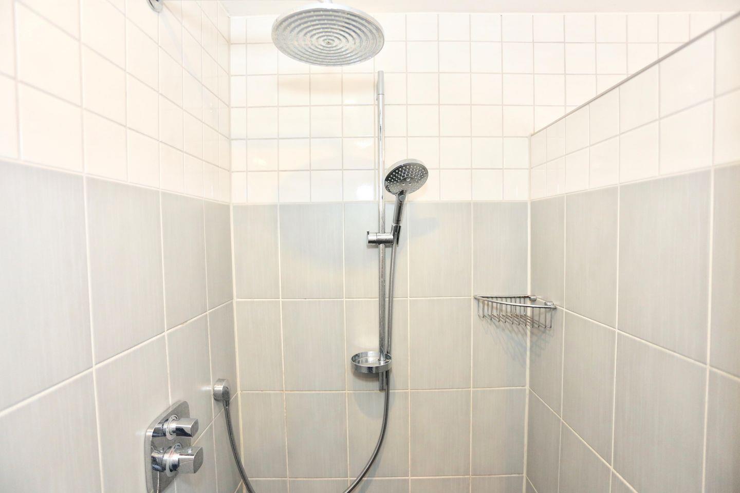 Das Badezimmer mit Fenster bietet eine große, ebenerdige Dusche sowie Doppelwaschbecken und WC. Seife, Duschgel und Shampoo stehen für Sie bereit.