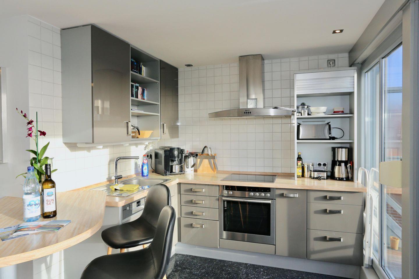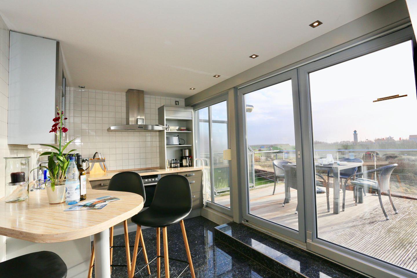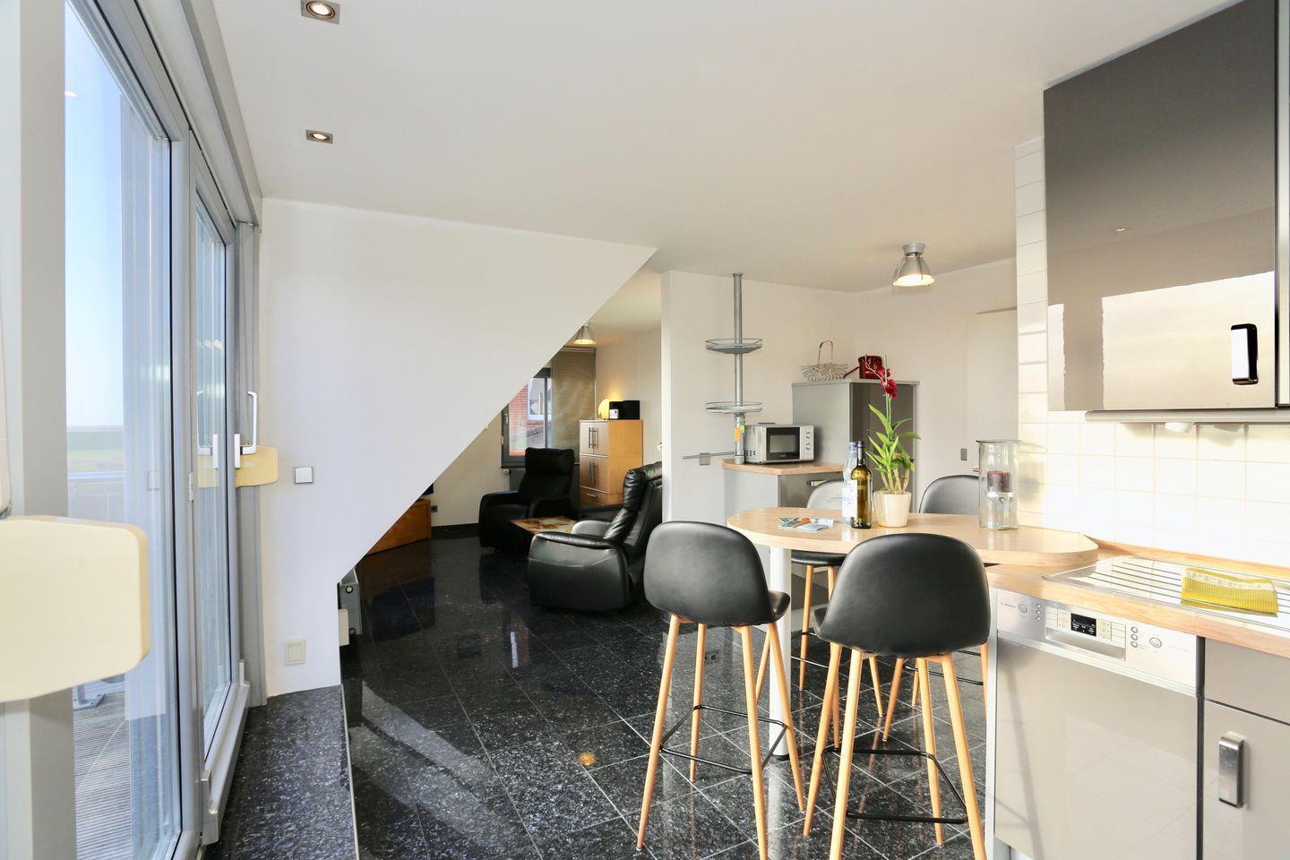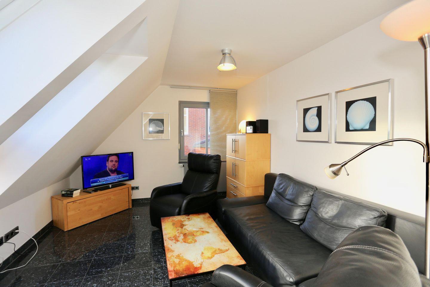 Genießen Sie den Komfort eines großen Balkons zur Südseite mit herrlichem Blick auf das Juister Wattenmeer. Das Wohnzimmer im unteren Bereich verfügt über einen Flachbild-TV und lädt mit einem hohen Esstisch, einem gemütlichen Sofa und zwei Lesesesseln zum Verweilen ein. Die Studioküche ist komplett ausgestattet mit Backofen, Wasserkocher, Kaffeemaschine, Toaster und Spülmaschine.