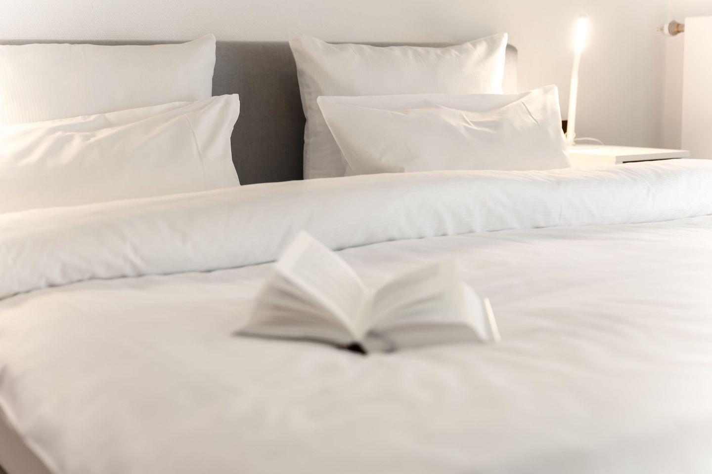Komfortables 2-Zimmer-Appartement mit einem separaten Schlafzimmer mit Boxspringbett und Etagenbett und Zugang zur Südterrasse, einem Wohnzimmer mit einem ausklappbaren Schlafsofa und Zugang zu 2 Terrassen zum Schiffchenteich und Kurplatz, einer separaten Miniküche mit Geschirrspüler und Mikrowelle, Bad mit Fenster und einem separaten Gäste-WC