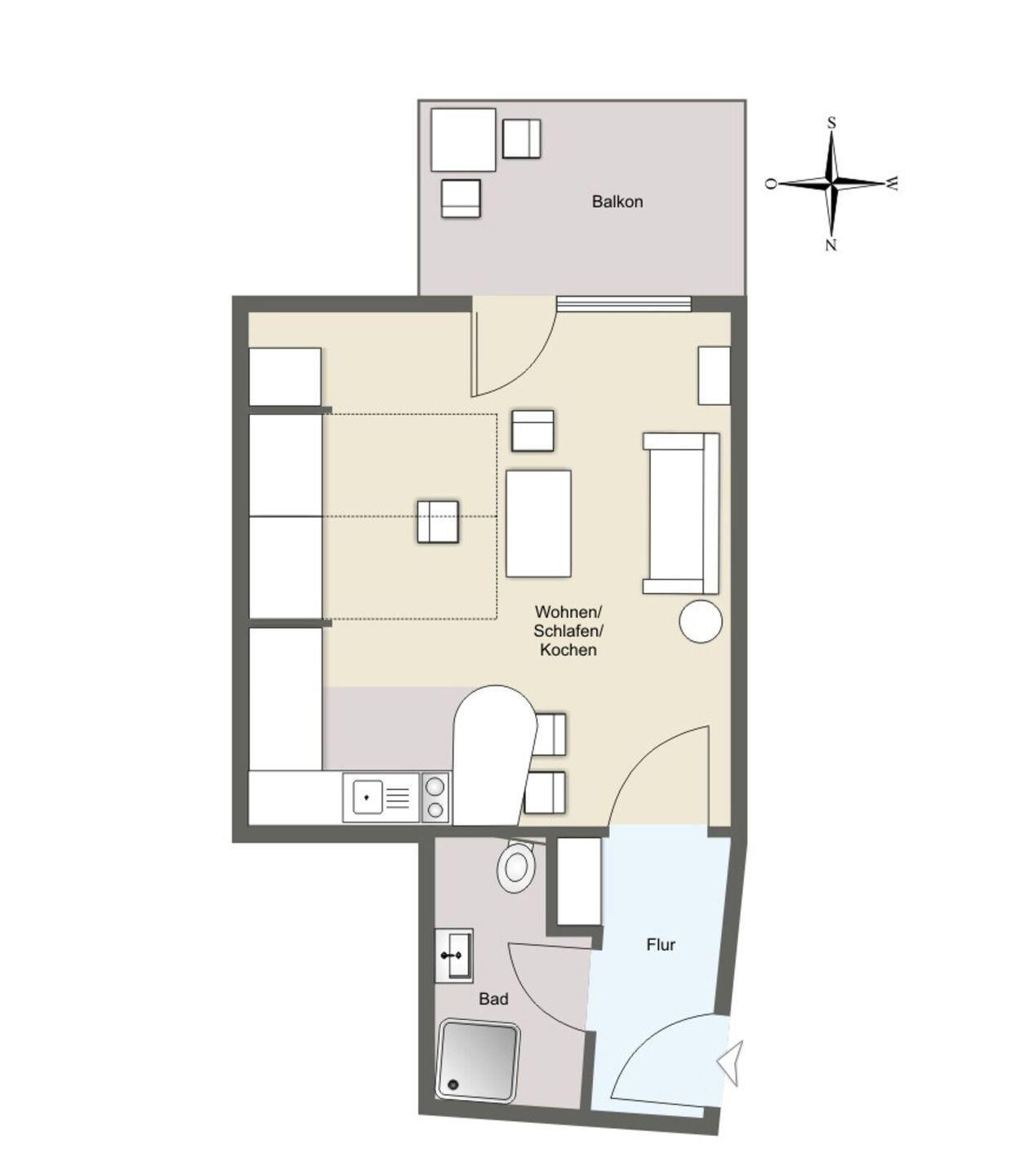 1-Zimmer-Appartement mit Schrankbetten und Zugang zum Südbalkon, einer Küchenzeile, Flur und Bad.