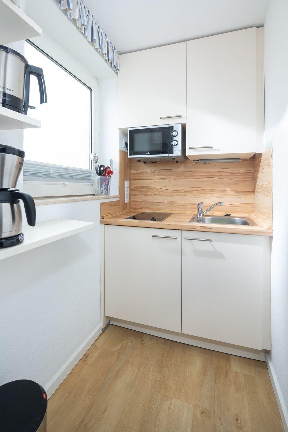 1- Zimmer- Appartement mit Doppelbett, ausklappbaren Schlafsofa, Küchenzeile mit Mikrowelle, Flur, Bad mit Fenster und Balkon zum Westen mit Abendsonne